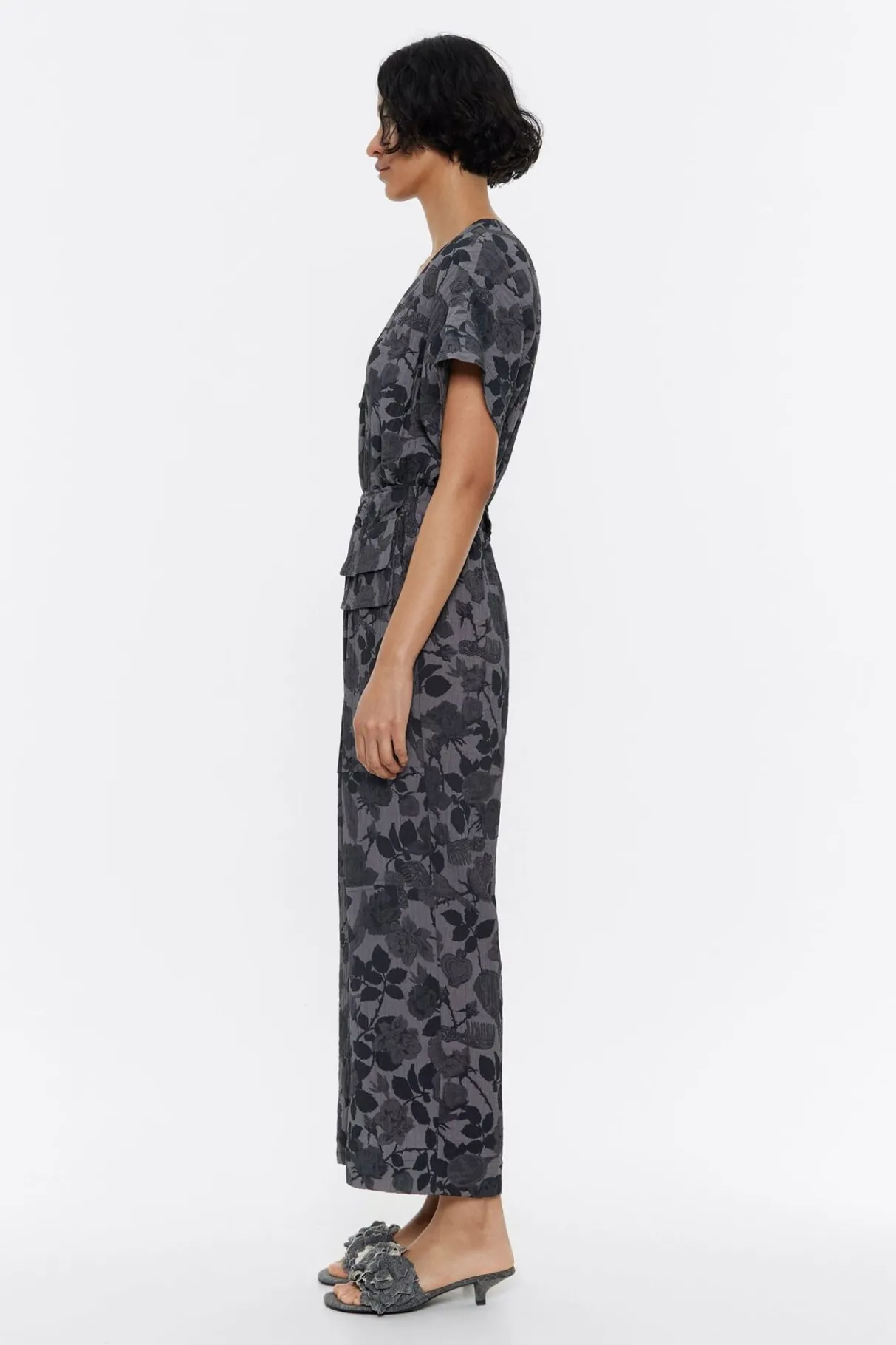 Mono Cargo De Viscosa Con Textura Con Print Canary Camo En Color Caqui. Modelo Con Largo Tobillero, Escote En V Pronunciado, Manga Corta Y Cierre Frontal Con Botonadura De PresiÓN. Bolsillos Saco En Los Laterales, Cintura Fruncida Con Goma Interior Y Pespuntes Triples En Toda La Prenda.