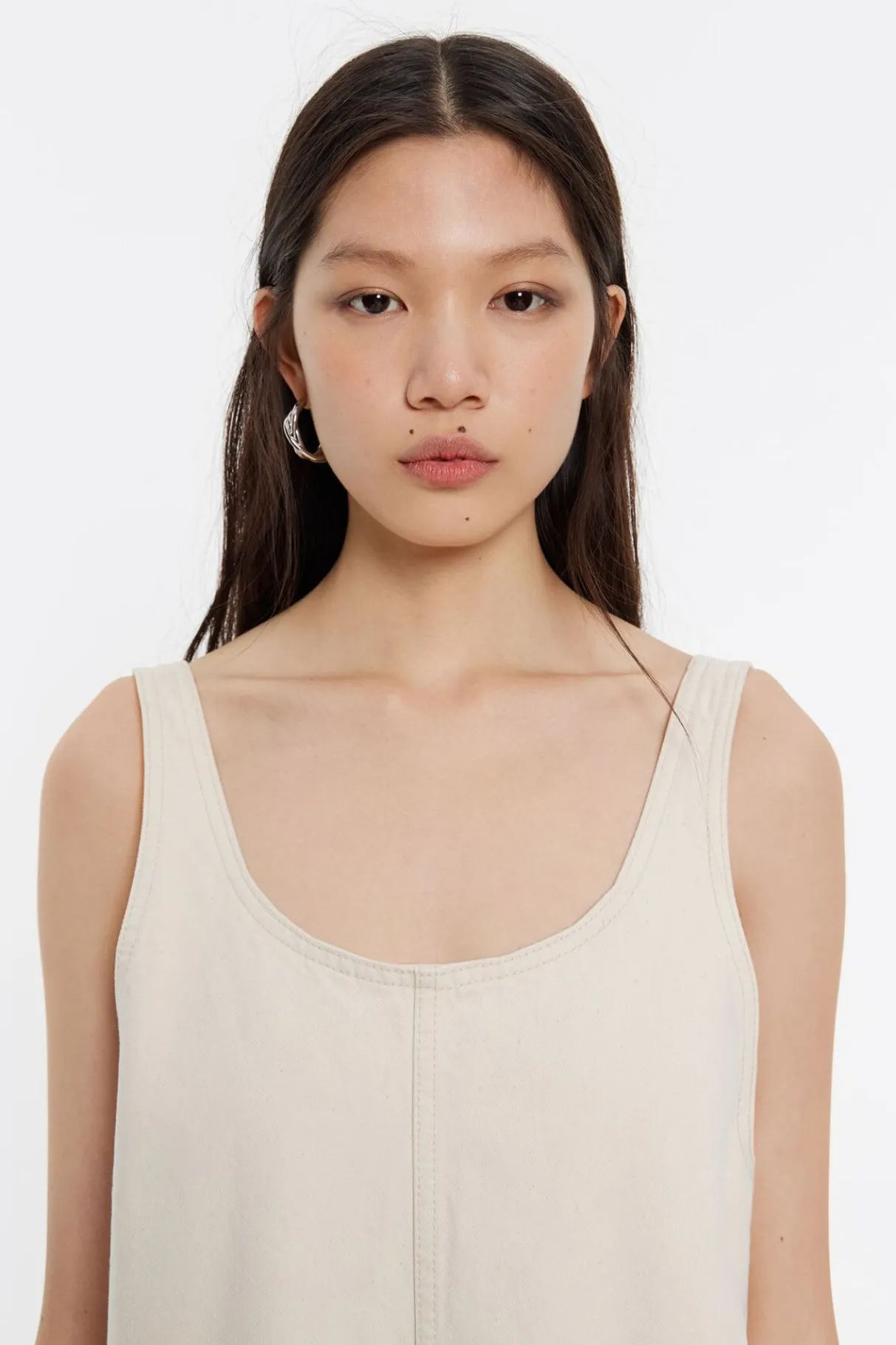 Mono Largo Denim En Color Crudo. Modelo De Corte Oversize, Escote Redondo Pronunciado, Manga Sisa Y Bolsillos En Costuras. Exterior Personalizado Con Logo Bordado. Este Modelo Contiene 20% Fibras Recicladas.