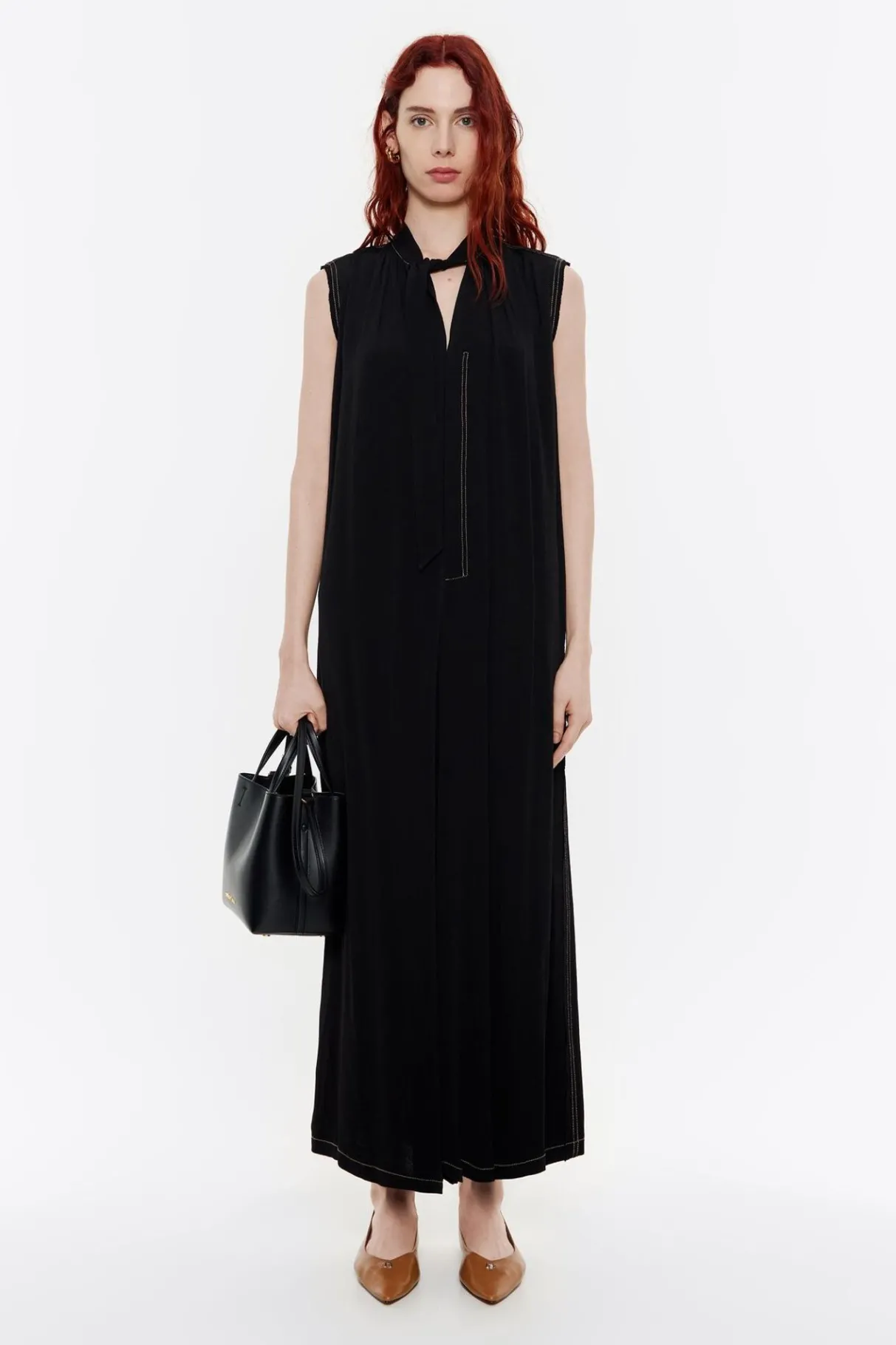 Mono Largo De Viscosa En Color Negro. Modelo De Corte Oversize, Cuello Mao Con Lazo, Manga Sisa Con Pespuntes A Contraste Y Cierre Frontal Con Botones Ocultos. Bolsillos En Costuras.