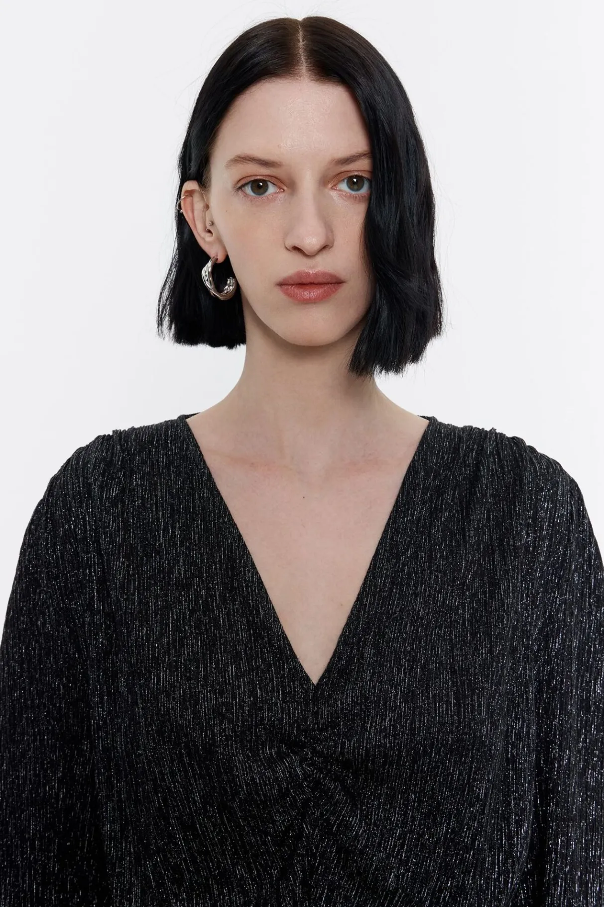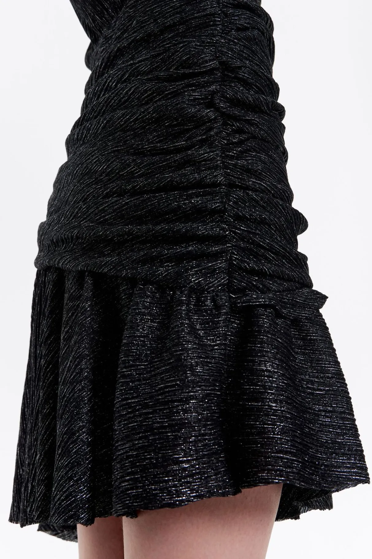 Vestido Fruncido Corto De LÚRex En Color Negro. Modelo De Corte Ajustado, Escote En V Pronunciado, Manga 3/4 Con Pliegues En Hombro Y LÁGrima Con BotÓN En Los PuÑOs. Cierre De Cremallera Invisible Lateral, Cintura Con Pieza Fruncida Y Bajo Irregular.