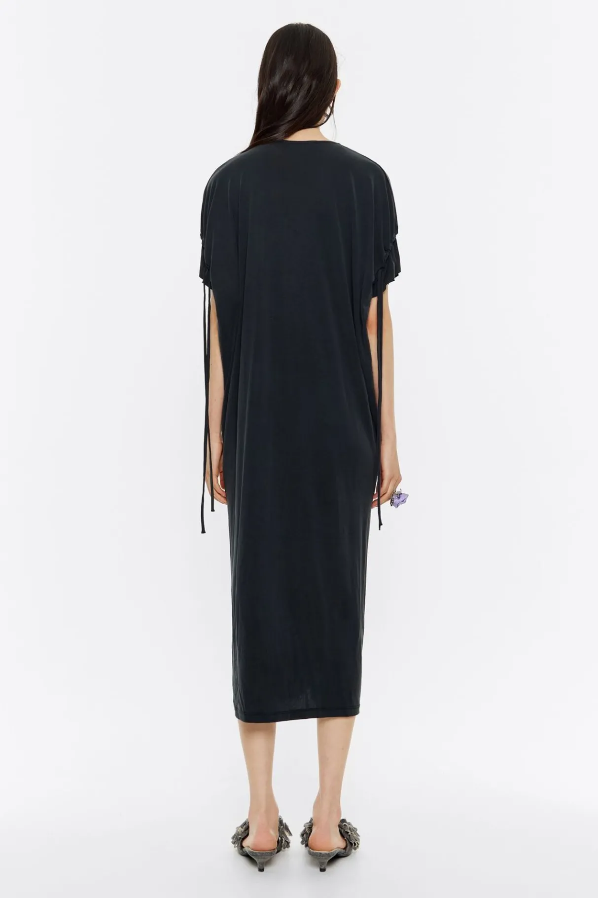 Vestido Fluido Midi En Color Negro Lavado. Modelo De Corte Recto, Escote En V Pronunciado, Manga Corta MurciÉLago Con Cordones En La Sisa Para Ajustar Y Fruncido Frontal Con Cordones De Tejido.