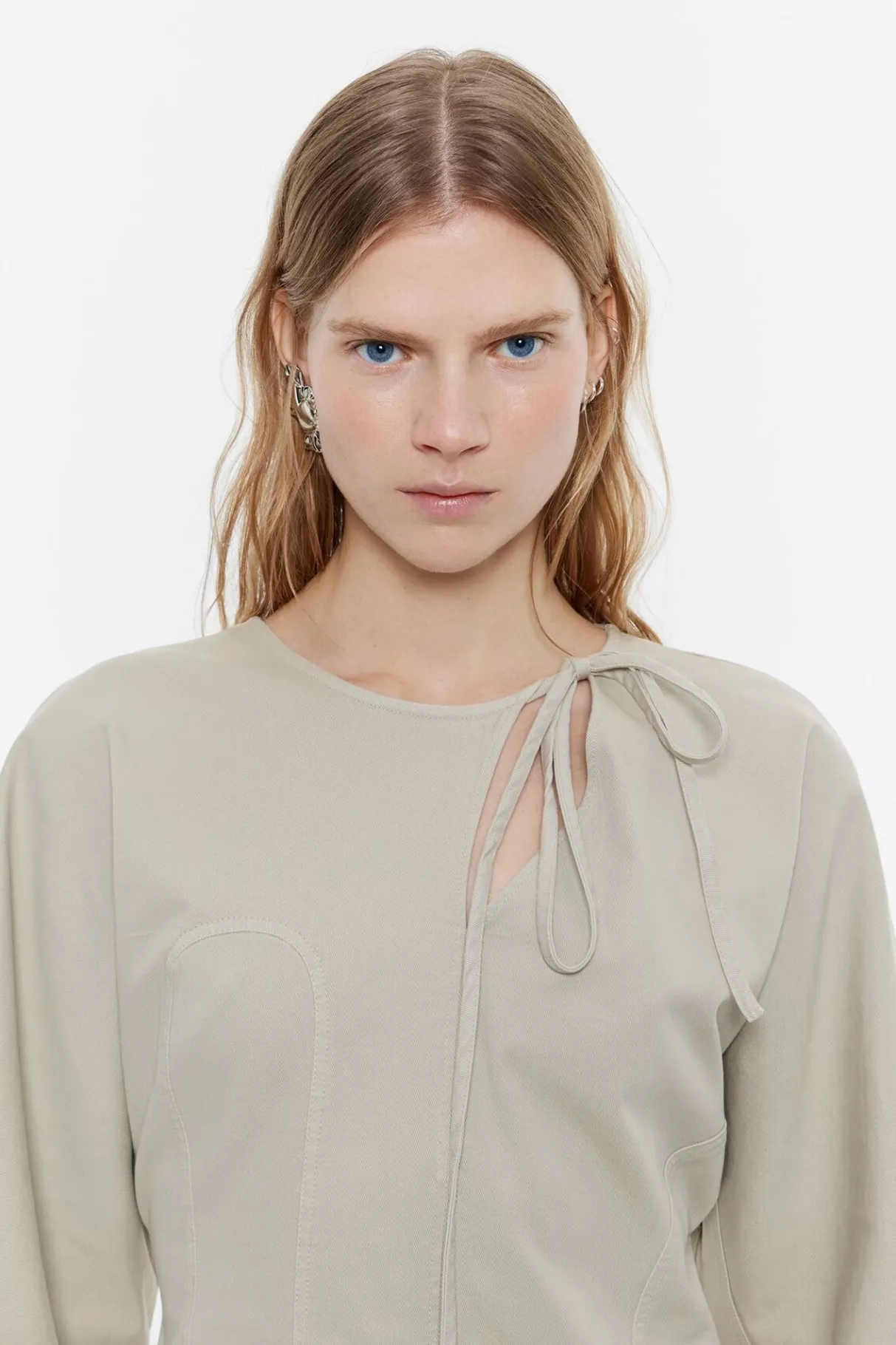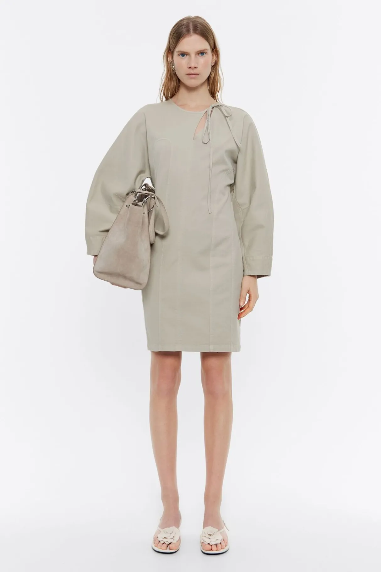 Vestido Mini De AlgodÓN En Color Verde Claro. Modelo De Corte Ajustado En Cintura, Cuello Caja Con Abertura Diagonal Y Manga Larga Con Volumen. Pespuntes En Toda La Prenda.