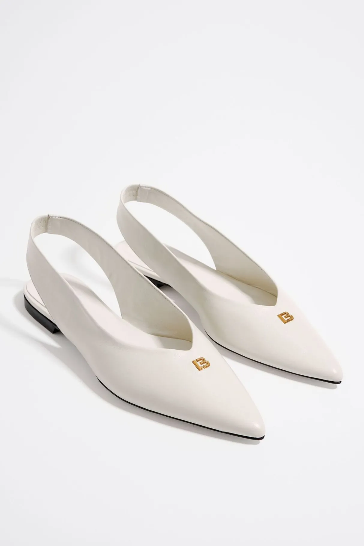 Bailarina De Piel Acabada En Punta Con Logo Lb MetÁLico En La Puntera En Color Marfil. Modelo Destalonado Con ElÁStico Trasero. Plantilla De Piel Con Logo Grabado Y Suela Personalizada.