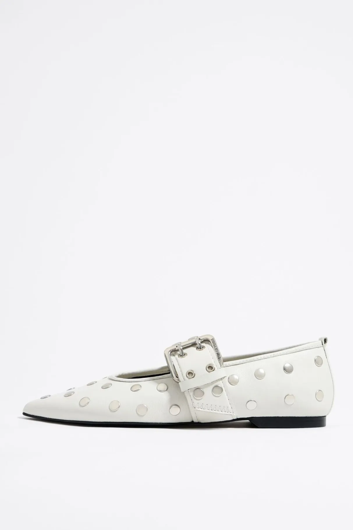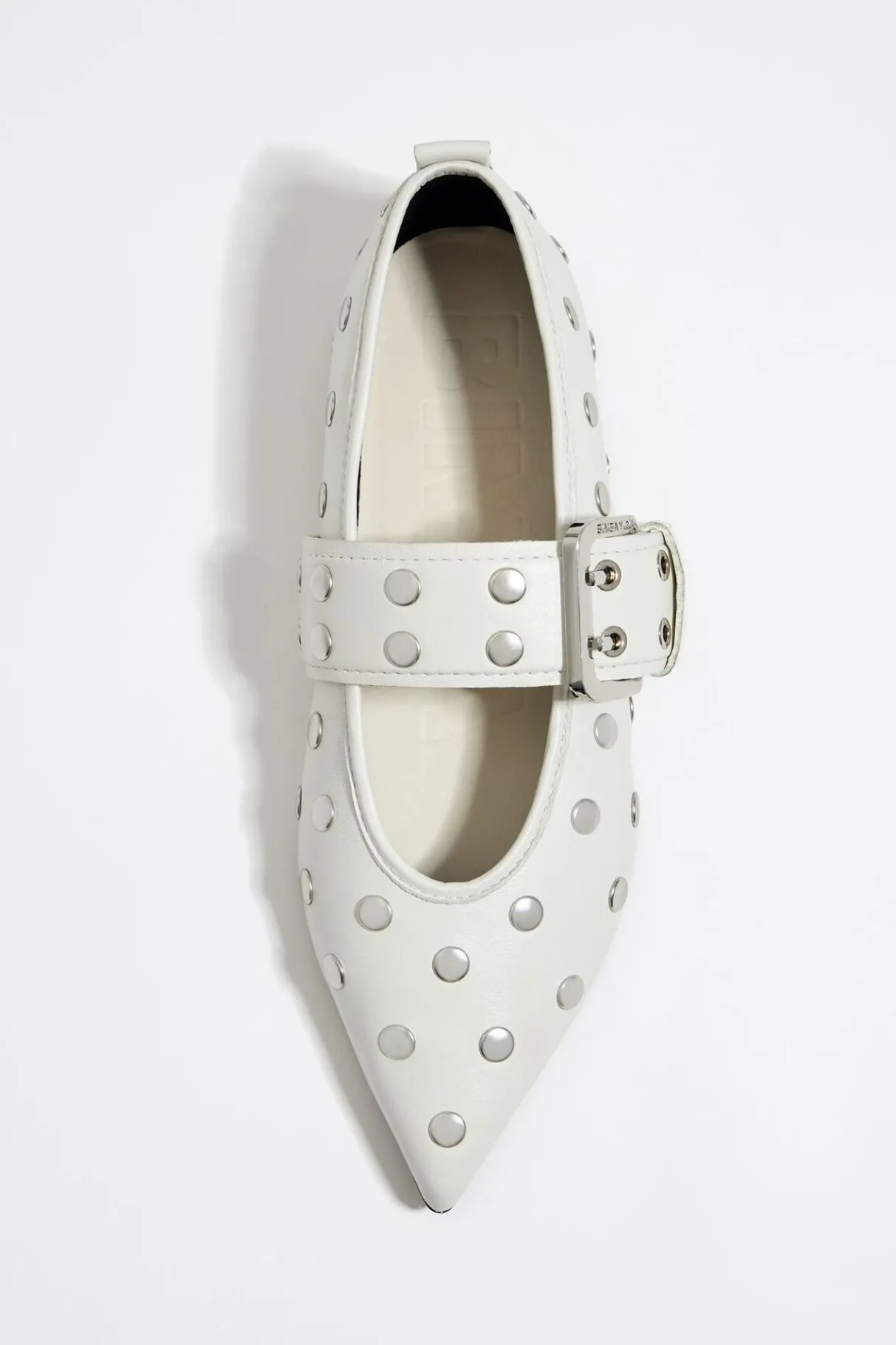 Bailarina Con Tachas De Piel En Color Blanco. Modelo Acabado En Punta Con Tira Ajustable En El Empeine Y Hebilla De Doble Pincho. Plantilla De Piel Con Logo Grabado Y Suela Personalizada.