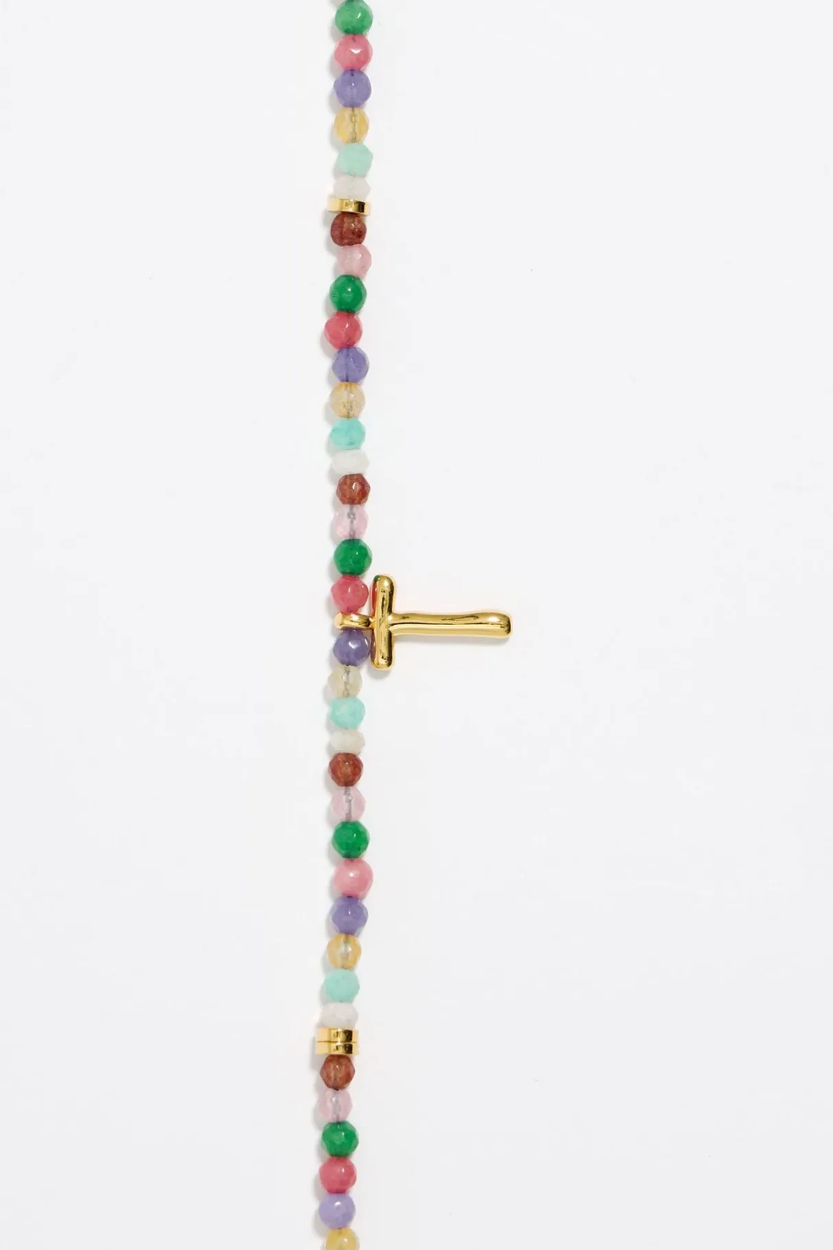 Collar Corto De Piedras Multicolores Con Letra T De Metal Dorado. Modelo Con Cierre De MosquetÓN Y Pieza En Forma De CorazÓN De Metal Dorado Con Cristal.