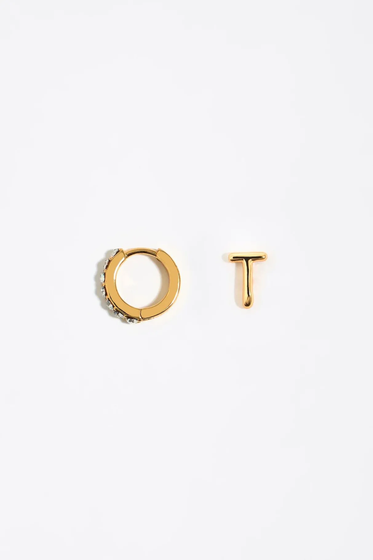 Pendientes De Aro Mini Dorado Con Cristales Y Letra T. Cierre De PresiÓN. Personalizado Con El Logo Grabado.