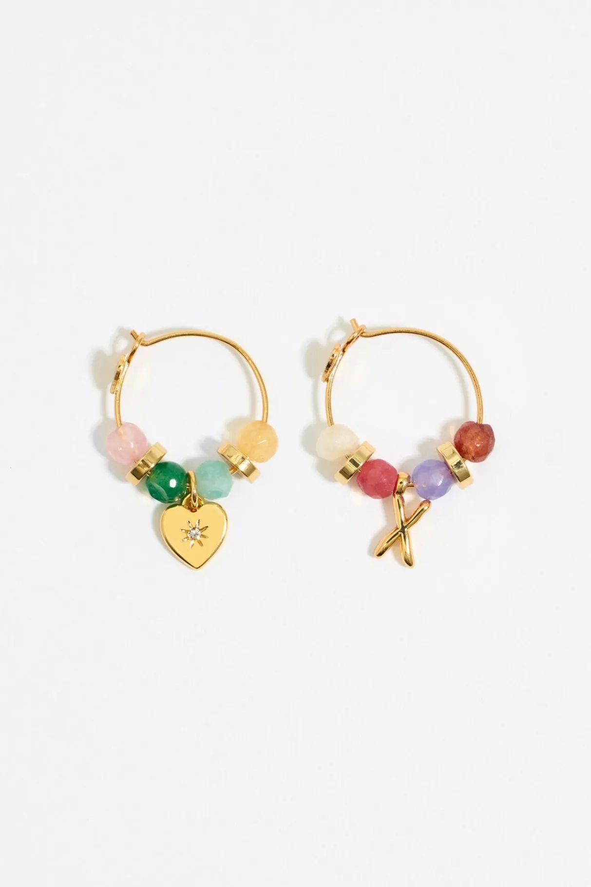 Pendientes De Aro Dorado Con Piedras Multicolores Y Colgantes En Metal Dorado De Letra X Y CorazÓN Con Cristal. Modelo Con Cierre De Gancho.