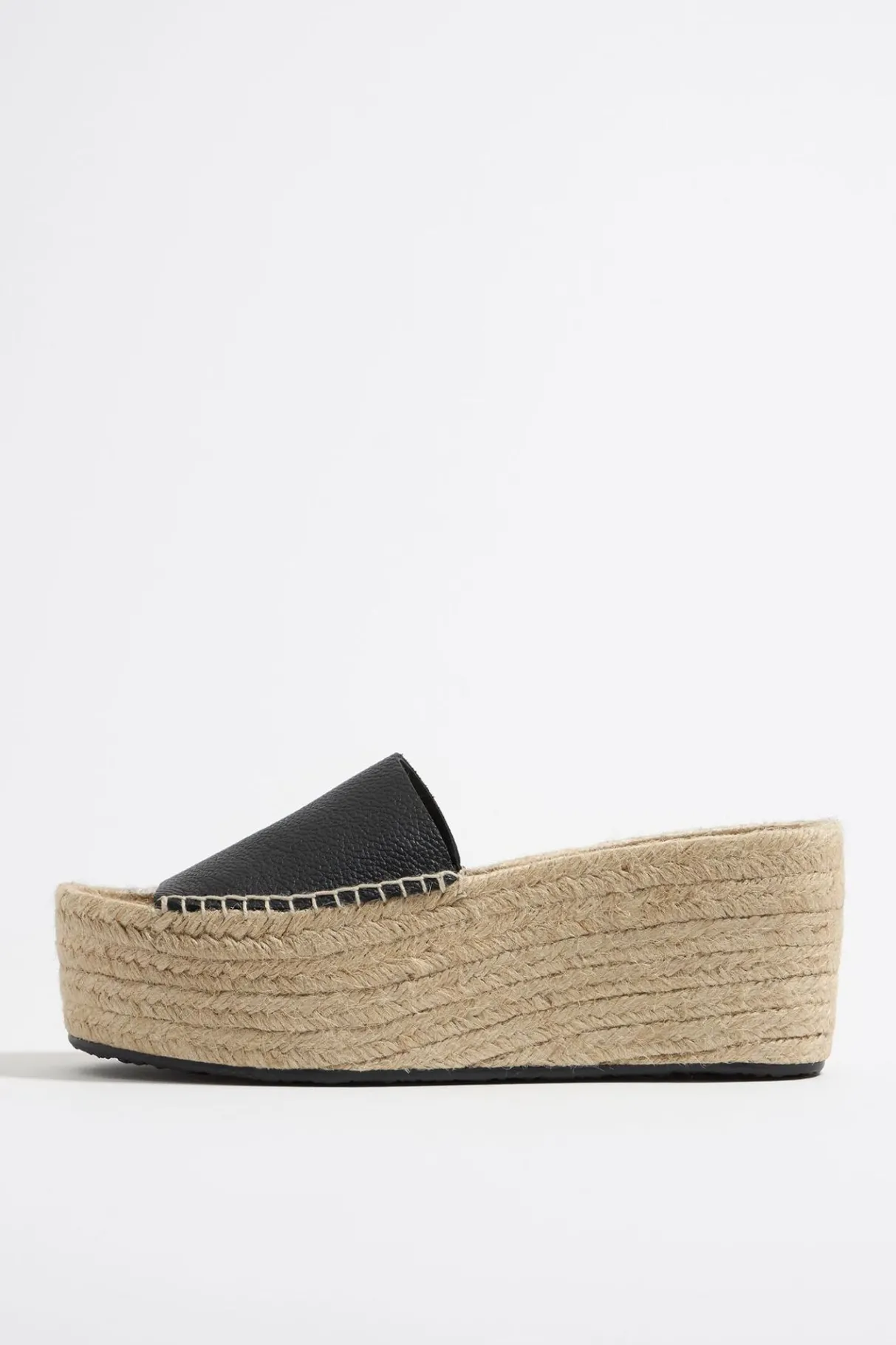Sandalia De CuÑA De Piel En Color Negro. Etiqueta Con Logo Bordado En Plantilla Y Piso De Plataforma De Yute Con Suela Personalizada.