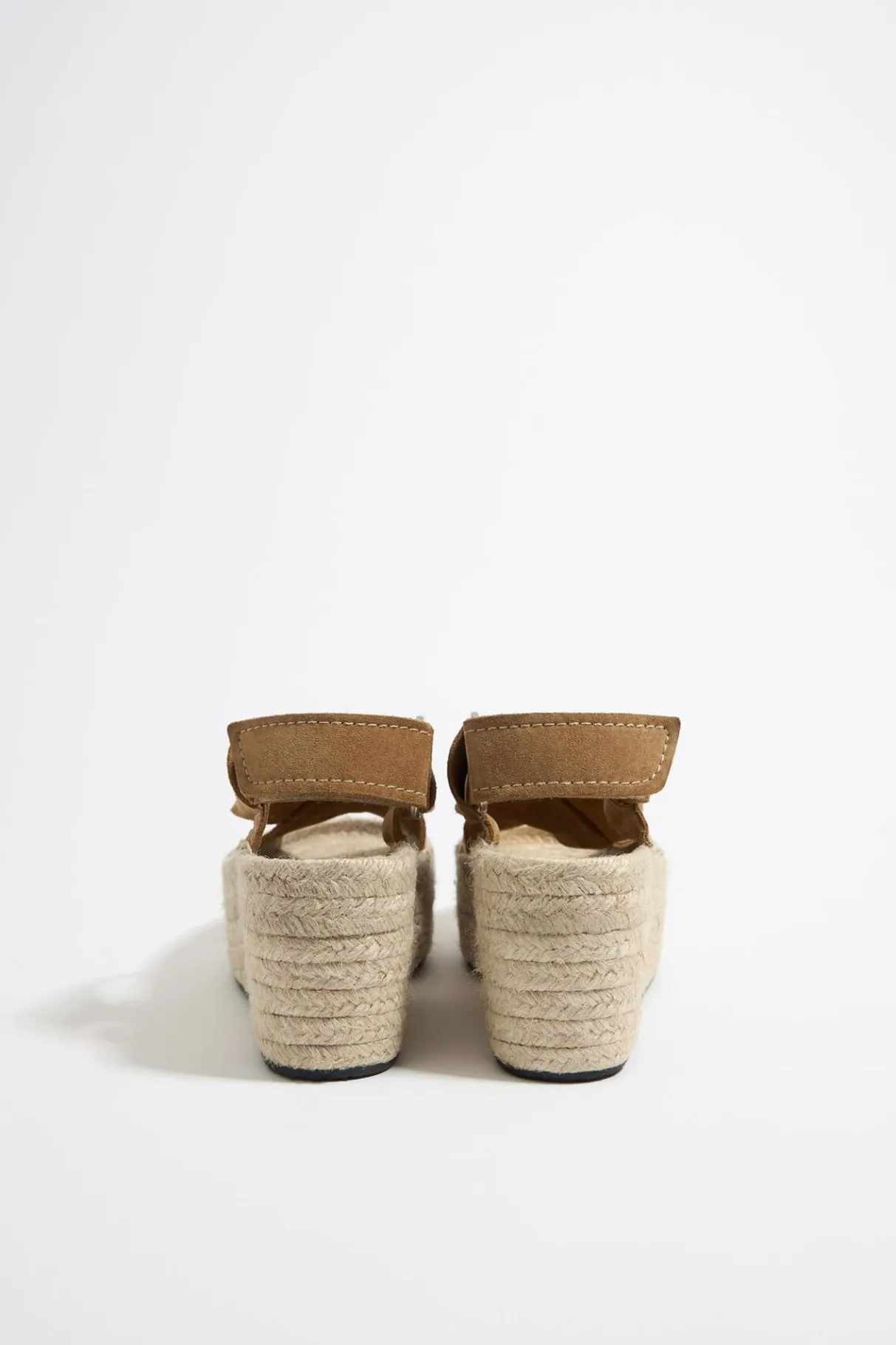 Sandalia De CuÑA De Serraje En Color MarrÓN. Modelo De Tiras Cruzadas Con Cierre Trasero Por Contacto. Etiqueta Con Logo Bordado En Plantilla Y Piso Plataforma De Yute Con Suela Personalizada.