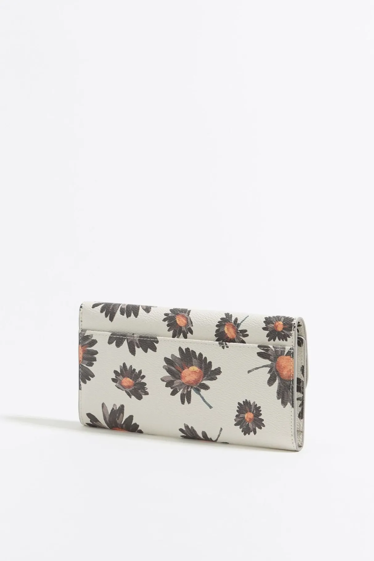 Billetera Con Textura Caviar Y Print Daisy En Color Marfil. Modelo Con Solapa Y Cierre A PresiÓN E Interior Con Monedero Y Tarjetero. Exterior Personalizado Con Logo MetÁLico. Este Modelo Contiene 100% Poliuretano De ProducciÓN Responsable + 100% PoliÉSter Reciclado + 100% AlgodÓN Reciclado.