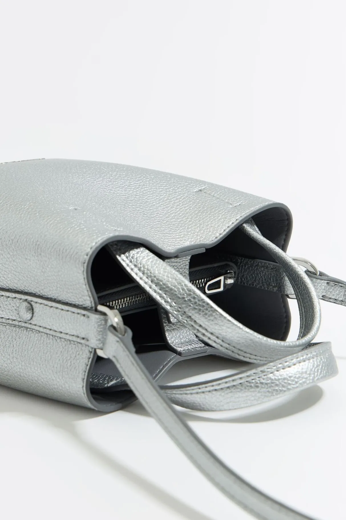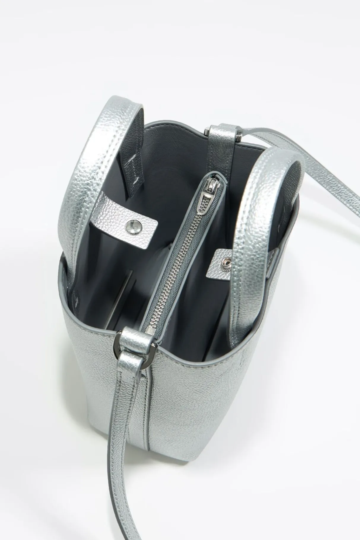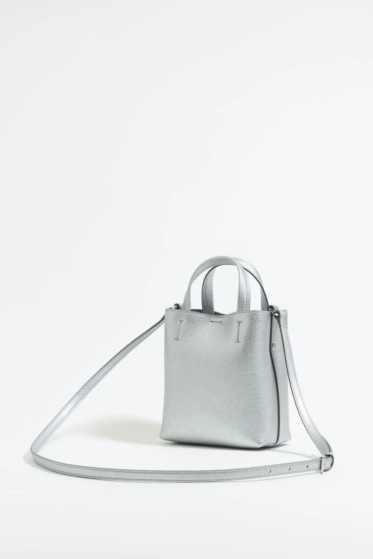 Bolso De Mano Chihuahua De Piel En Color Plata. Modelo De TamaÑO Mini, Con Cierre A PresiÓN, Doble Asa De Mano, Asa De Piel Ajustable Y Bolsillo Interior Con Cremallera. Exterior Personalizado Con Logo MetÁLico.