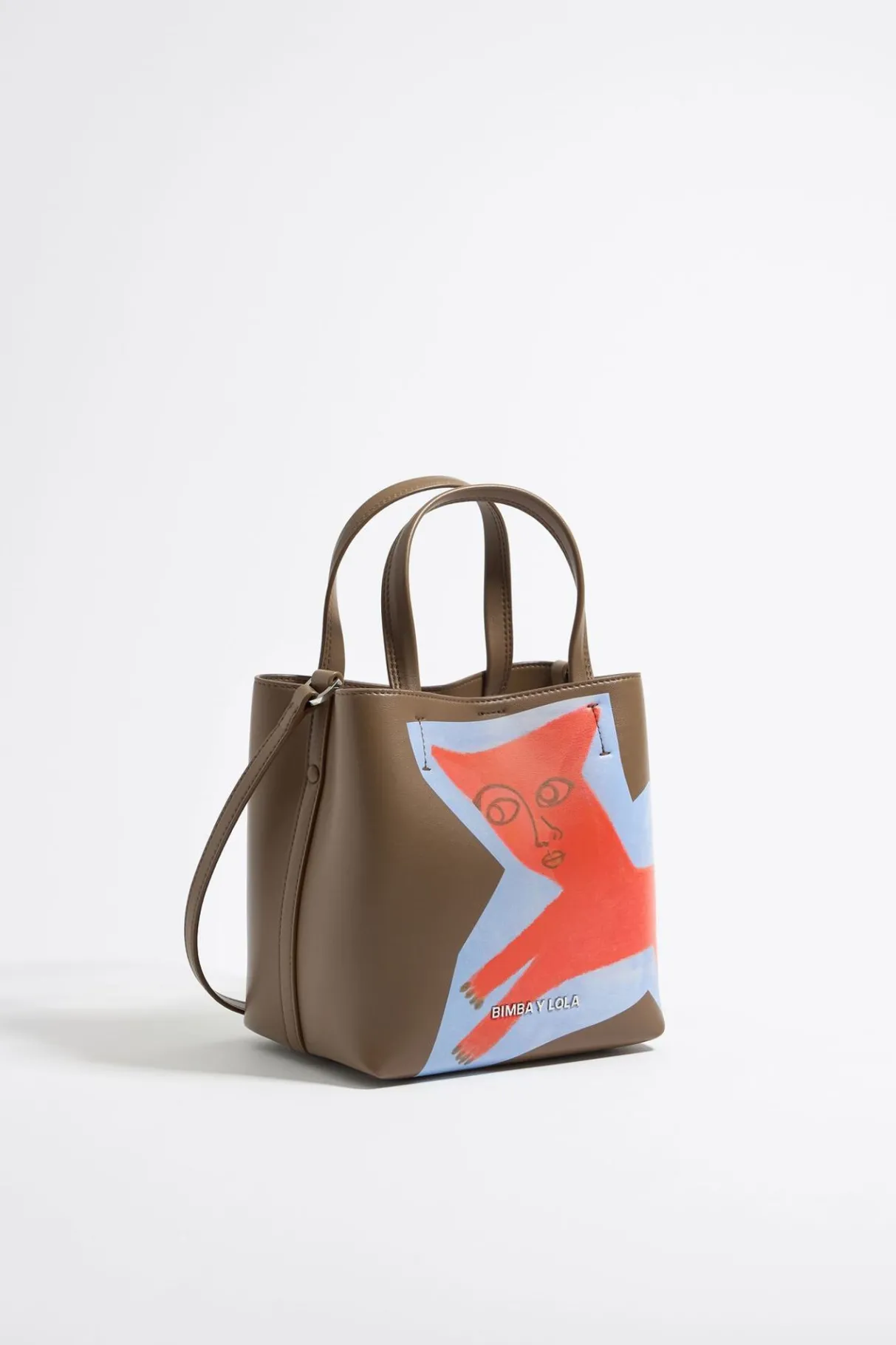 Bolso De Mano Chihuahua De Piel Reconstituida En Color Topo Oscuro; EdiciÓN Limitada Ilustrada En ColaboraciÓN Con La Artista Mexicana Ana Leovy. Modelo De TamaÑO PequeÑO, Cierre A PresiÓN, Doble Asa De Mano, Asa Larga De Piel Ajustable Y Bolsillo Interior Con Cremallera. Exterior Personalizado Con Logo MetÁLico.
