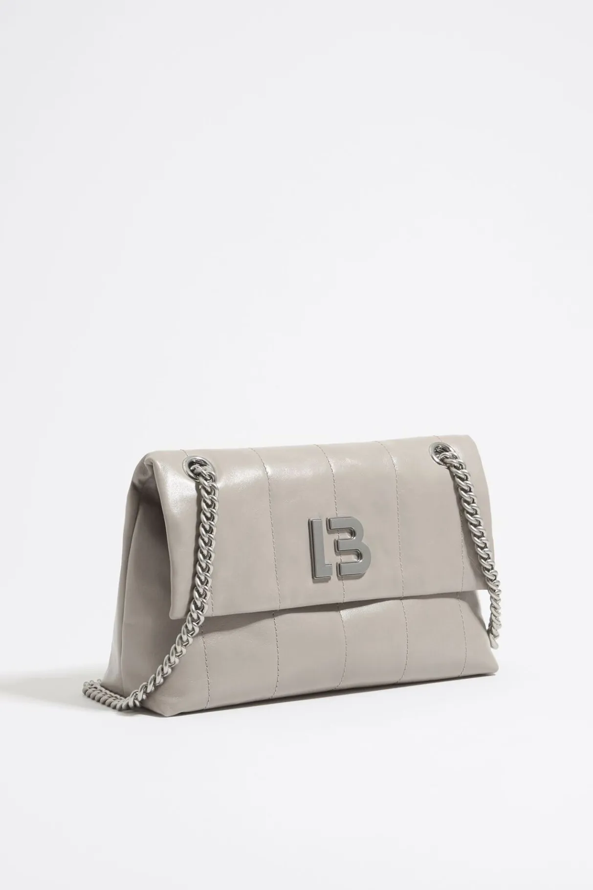 Bolso Bandolera De Piel En Color Gris Verdoso. Modelo De TamaÑO Mediano, Cierre MagnÉTico De Solapa Y Asa De Cadena. Exterior Personalizado Con Logo Lb MetÁLico. Este Modelo Contiene 100% PoliÉSter Reciclado.