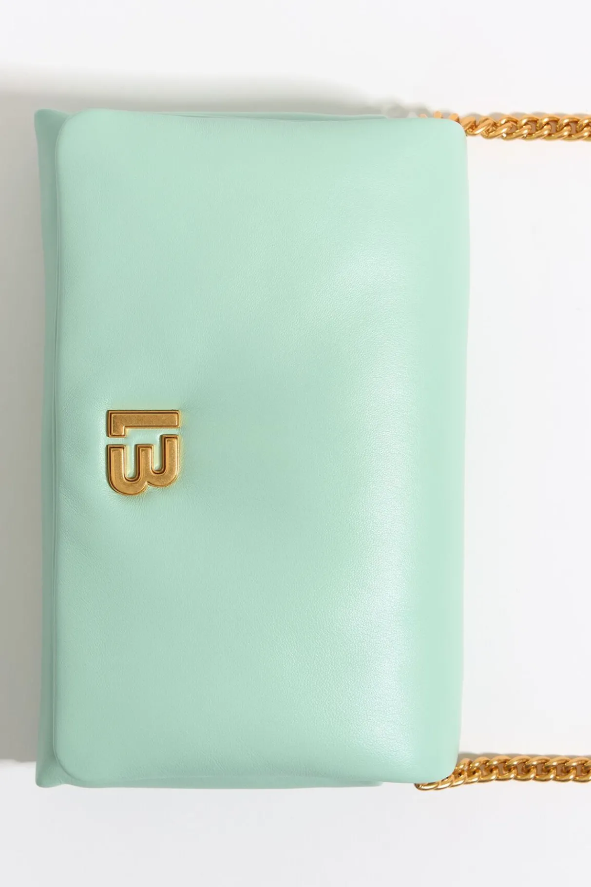 Bolso Bandolera De Piel Napa En Color Azul Hielo. Modelo De TamaÑO Mini Con Cierre De Solapa, Asa De Cadena Y Bolsillo Interior. Exterior Personalizado Con Logo Lb MetÁLico.