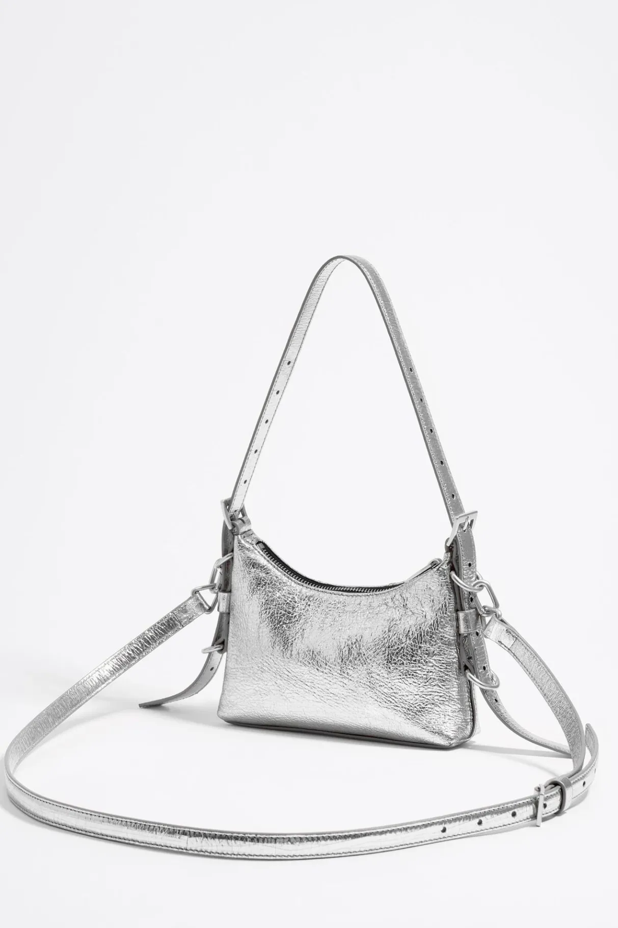 Bolso Hobo Pocket De Piel Metalizada En Color Plata. Modelo De TamaÑO Mini, Cierre De Cremallera Y Doble Asa Ajustable, De Hombro Y Bandolera De Piel. Exterior Personalizado Con Logo MetÁLico. Este Modelo Contiene 100% PoliÉSter Reciclado.