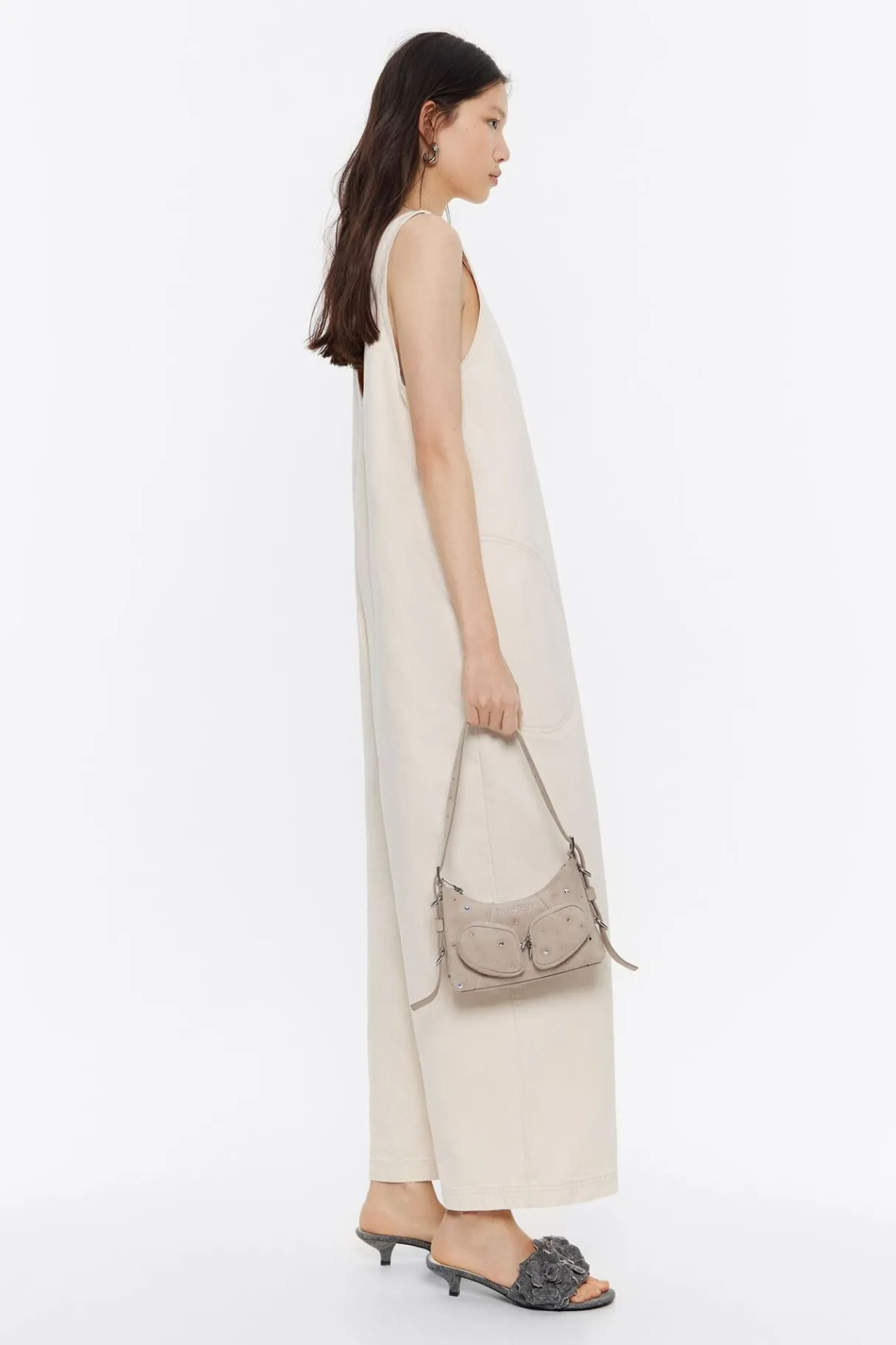 Bolso Hobo Pocket De Piel En Color Piedra Con Cristales De Swarovski. Modelo De TamaÑO Mini, Cierre De Cremallera Y Doble Asa Ajustable, De Hombro Y Bandolera De Piel. Exterior Personalizado Con Logo MetÁLico. Este Modelo Contiene 100% PoliÉSter Reciclado.