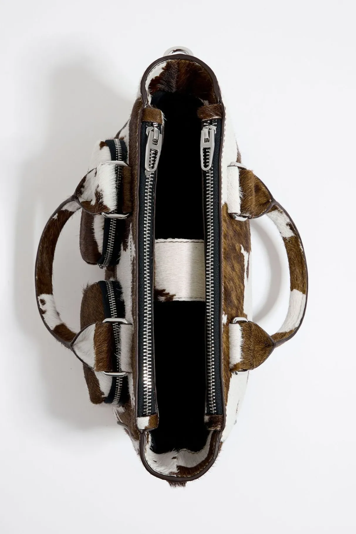 Bolso Tote Pocket De Piel Con Pelo Y Print Vaca En Color MarrÓN. Modelo De TamaÑO Mediano, Dos Compartimentos Con Cierre De Cremallera Y Cierre MagnÉTico, Doble Asa De Mano Y Asa Bandolera De Piel. Interior Personalizado Con Etiqueta De Piel. Exterior Personalizado Con Logo MetÁLico.
