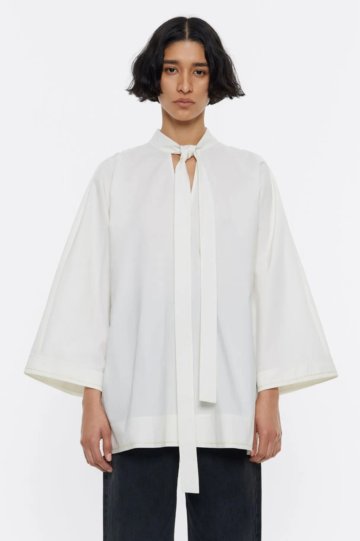 Camisa Larga De AlgodÓN En Color Marfil. Modelo De Corte LÍNea A, Con Cuello Mao Con Lazo A Modo De Cierre Y Manga Larga Ancha Con Pespunte Bordado En PuÑOs. Hombros Fruncidos Y Pespunte Bordado En Bajo.