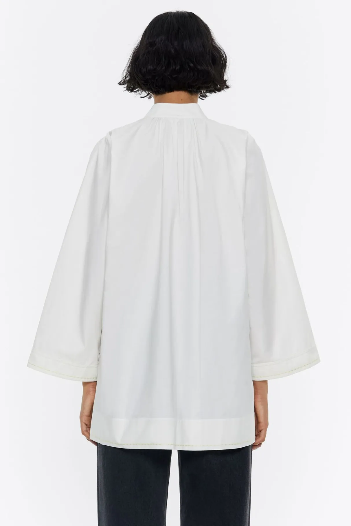 Camisa Larga De AlgodÓN En Color Marfil. Modelo De Corte LÍNea A, Con Cuello Mao Con Lazo A Modo De Cierre Y Manga Larga Ancha Con Pespunte Bordado En PuÑOs. Hombros Fruncidos Y Pespunte Bordado En Bajo.