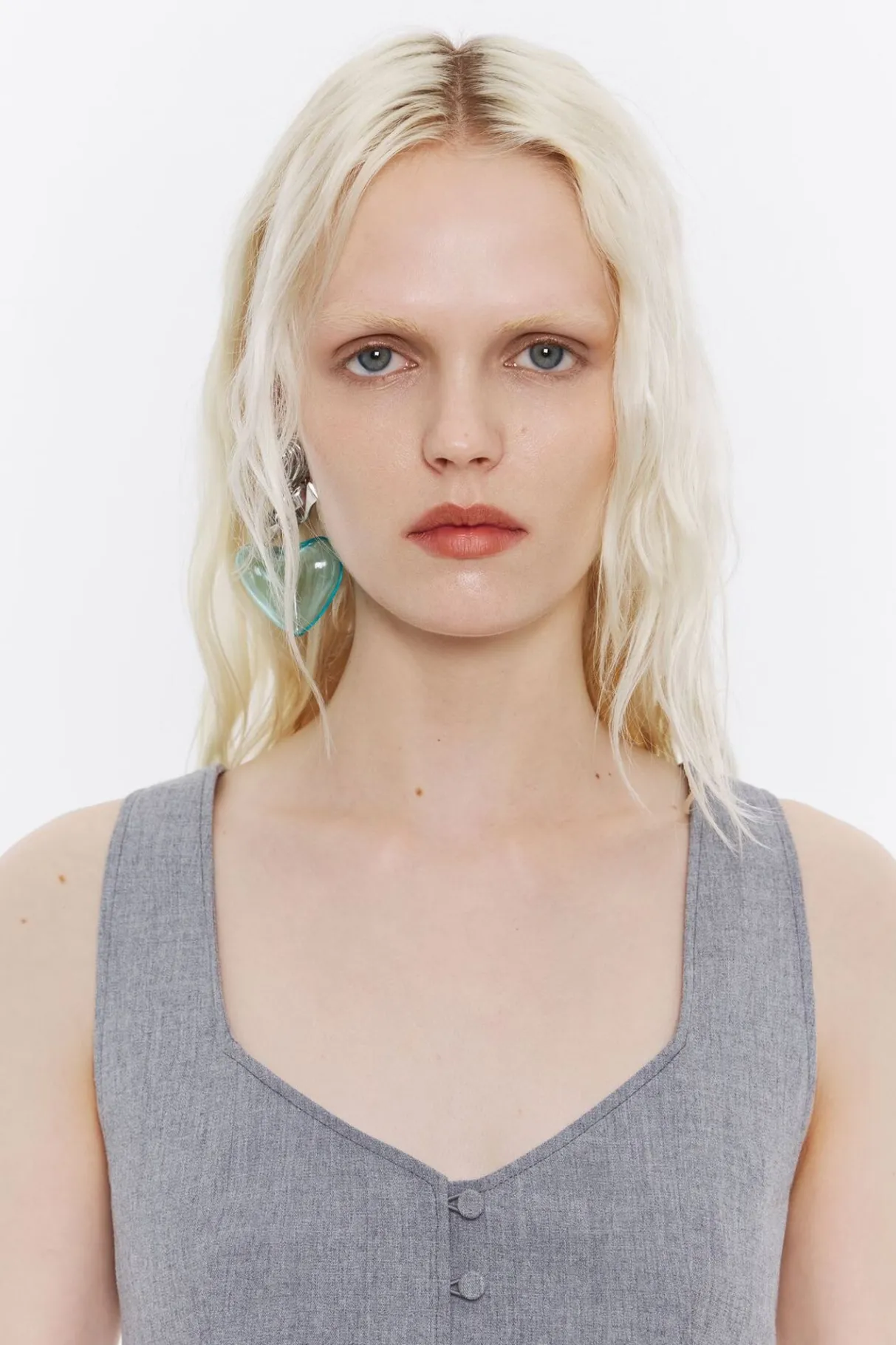 Top Ajustado De Lana FrÍA En Color Gris. Modelo Con Escote Pronunciado, Manga Sisa Y Cierre Frontal Con Botones Forrados. Bajo Con Volante.