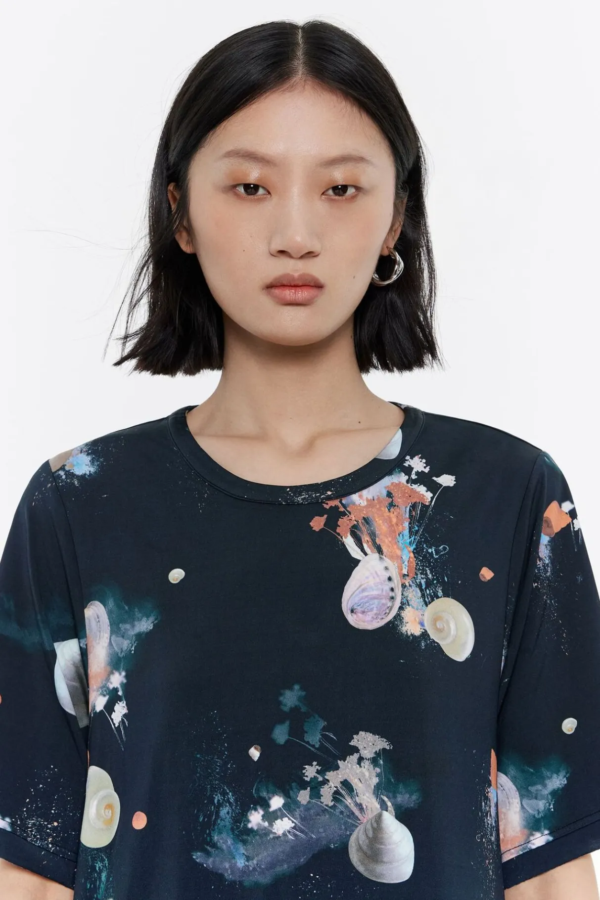 Camiseta De Viscosa Con Print Waves En Color Antracita. Modelo De Corte Boxy, Cuello Caja Con Maxiabertura Y Manga Corta. Espalda Con Falso Nudo.