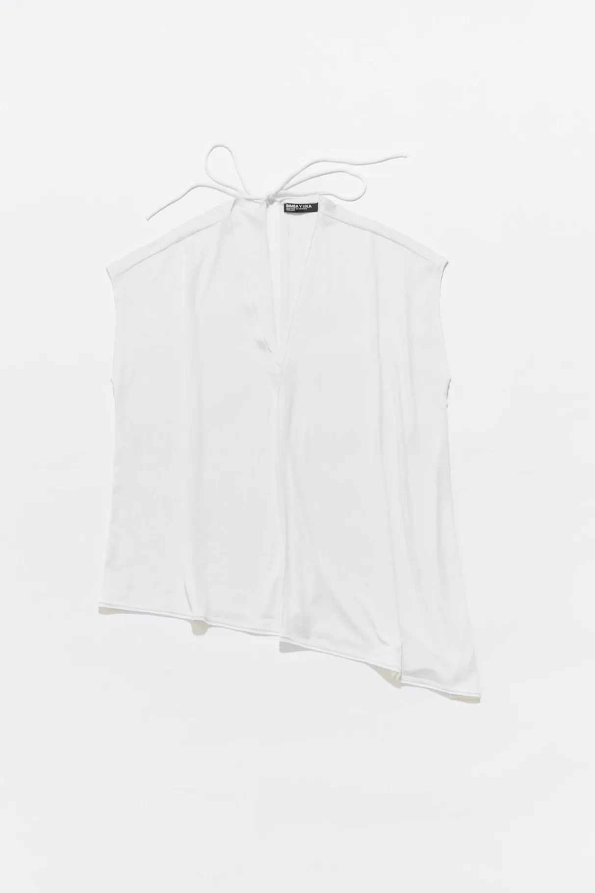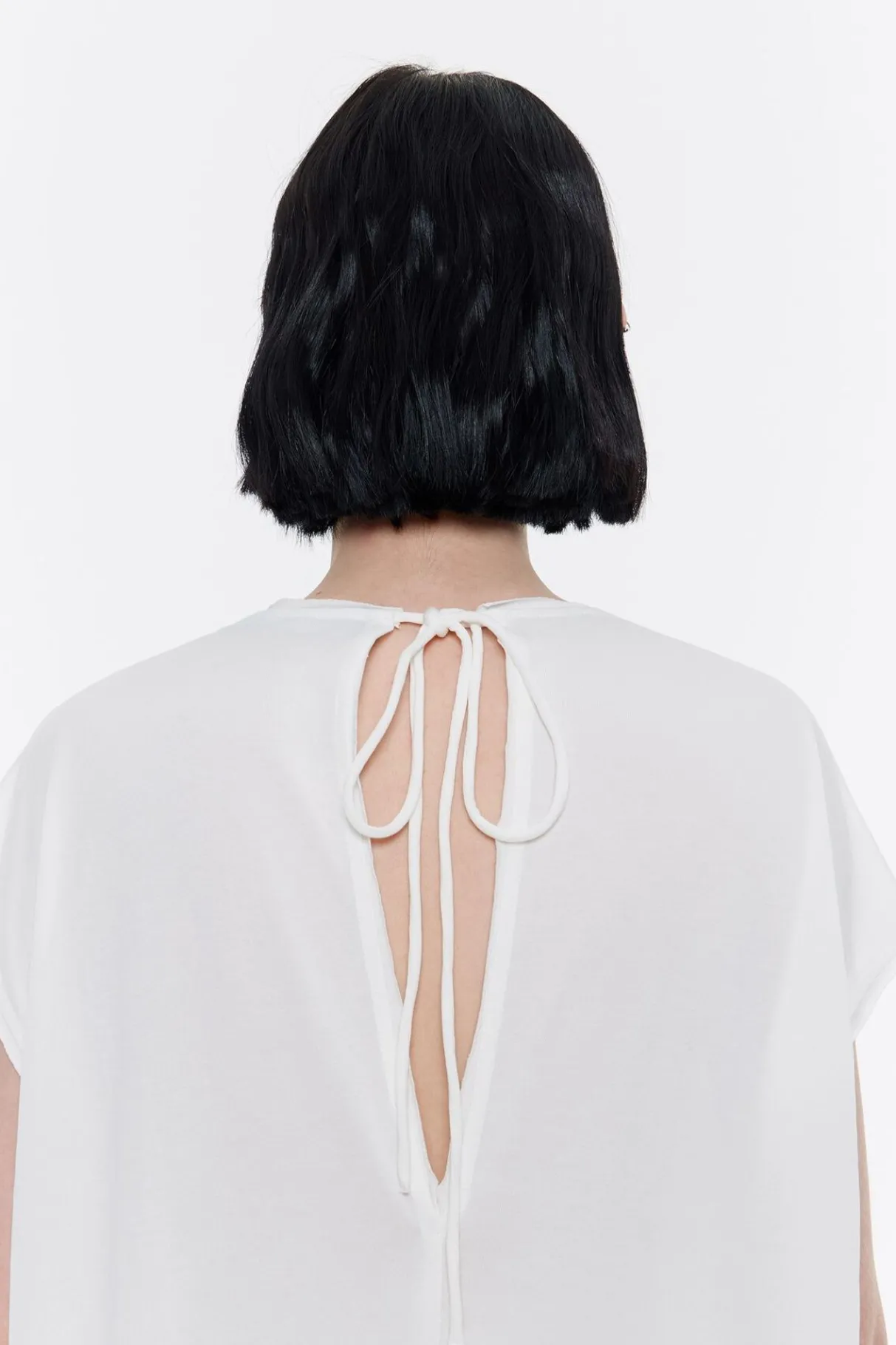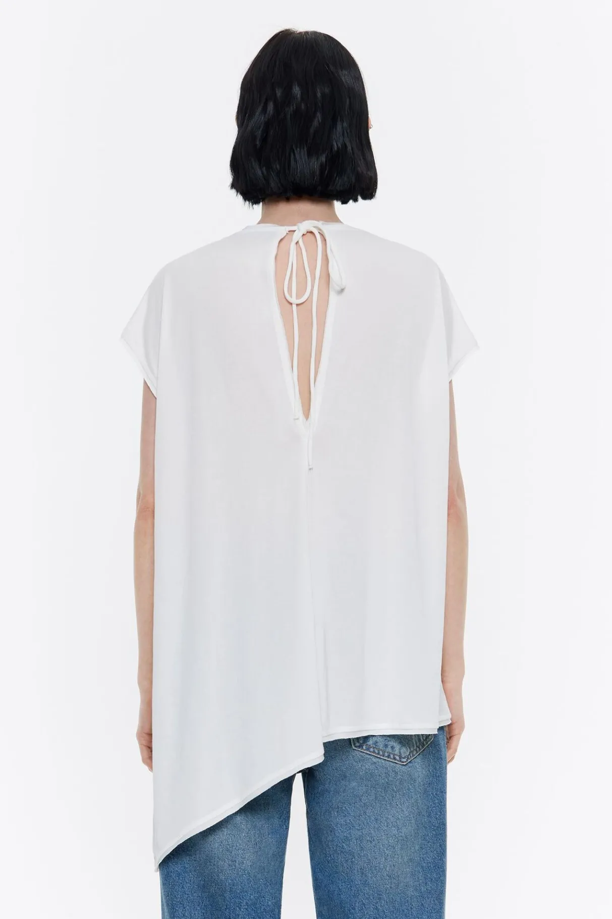 Top Largo En Color Marfil. Modelo De Corte Oversize, Escote En V Pronunciado Con Vivo En El Talle, Manga Corta CaÍDa Con Vivo En El Talle Y Cierre Trasero Con CordÓN De Tejido. Bajo Irregular Y MaxilÁGrima En Espalda.