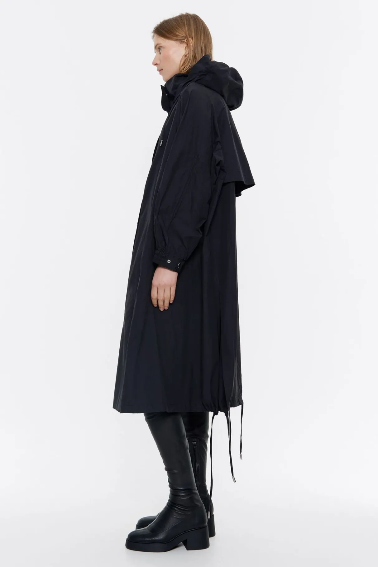 Gabardina Larga De AlgodÓN En Color Negro. Modelo De Corte LÍNea A, Cuello Alto Con Capucha, Manga Larga Ranglan Con Volumen Y PuÑOs Ajustables, Y Cierre Frontal Con Botonadura De PresiÓN. Bolsillos Frontales Con Vivo Y Bajo Ajustable Con Cordones De Tejido.