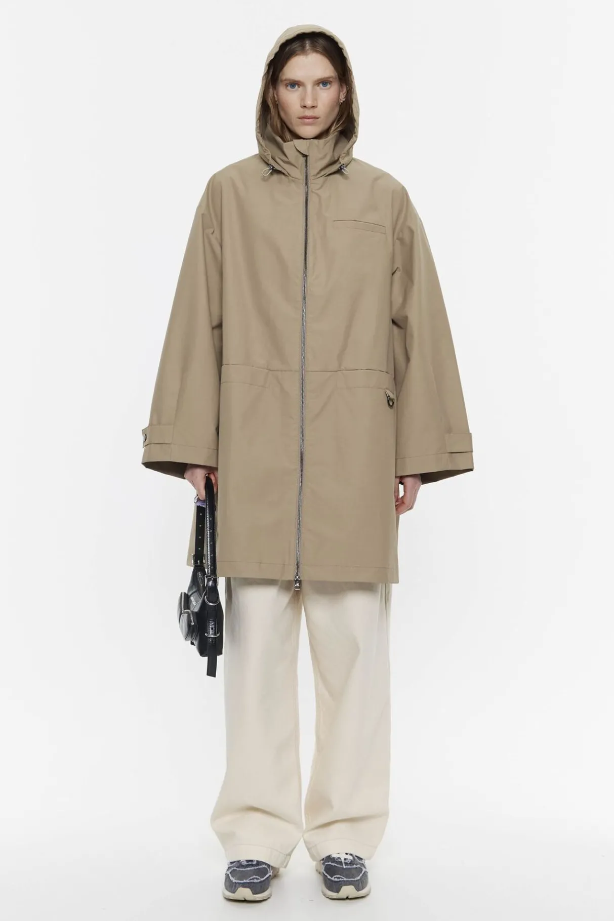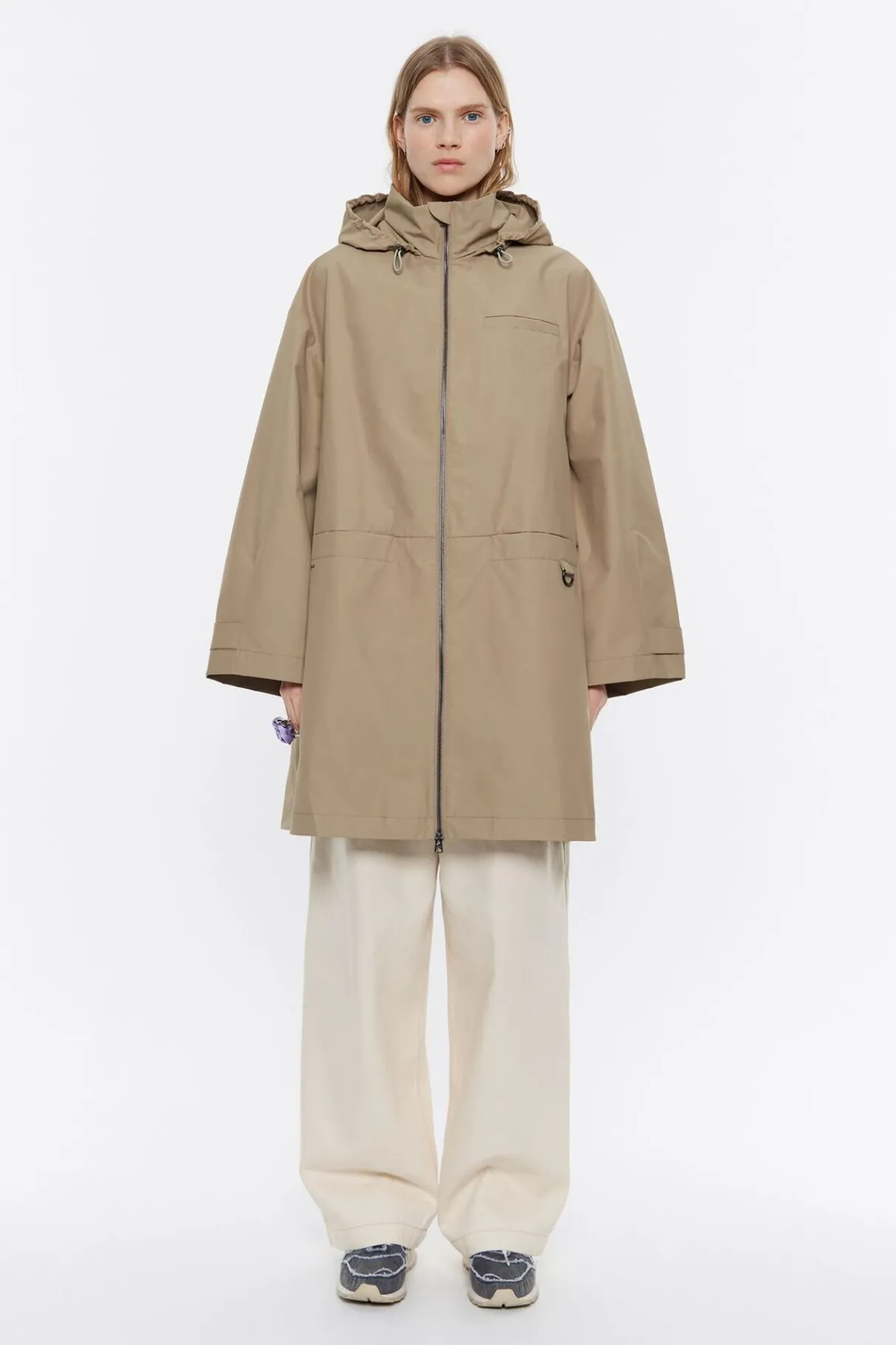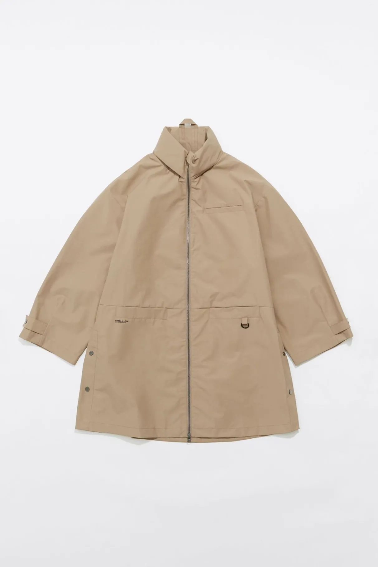 Gabardina Midi De Tejido TÉCnico En Color Caqui. Modelo De Corte LÍNea A, Cuello Alto Con Capucha Plegable Y Ajustable, Manga Larga Con Trabilla Y BotÓN De PresiÓN En PuÑO, Y Cierre Frontal Con Cremallera De Nylon. Bolsillos Horizontales En Costura Y Exterior Personalizado Con Logo Estampado.