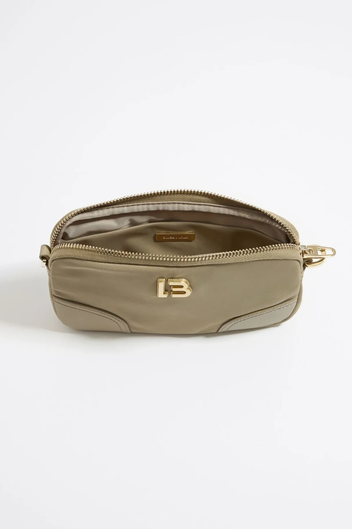 Bolso Bandolera De Nylon En Color Caqui Claro. Modelo De TamaÑO Mini, Cierre De Cremallera, Asa Larga De Piel Y Cadena, Y Bolsillo Interior. Exterior Personalizado Con Logo Lb. Este Modelo Contiene 100% Poliamida Reciclada + 100% PoliÉSter Reciclado.