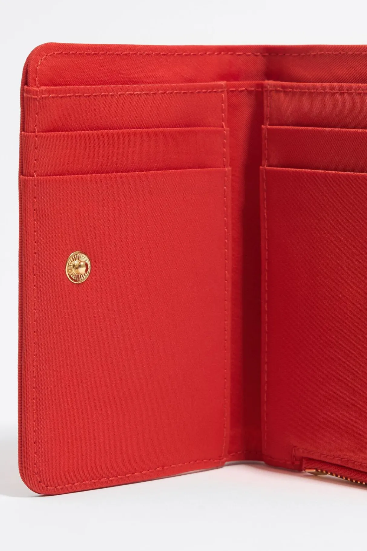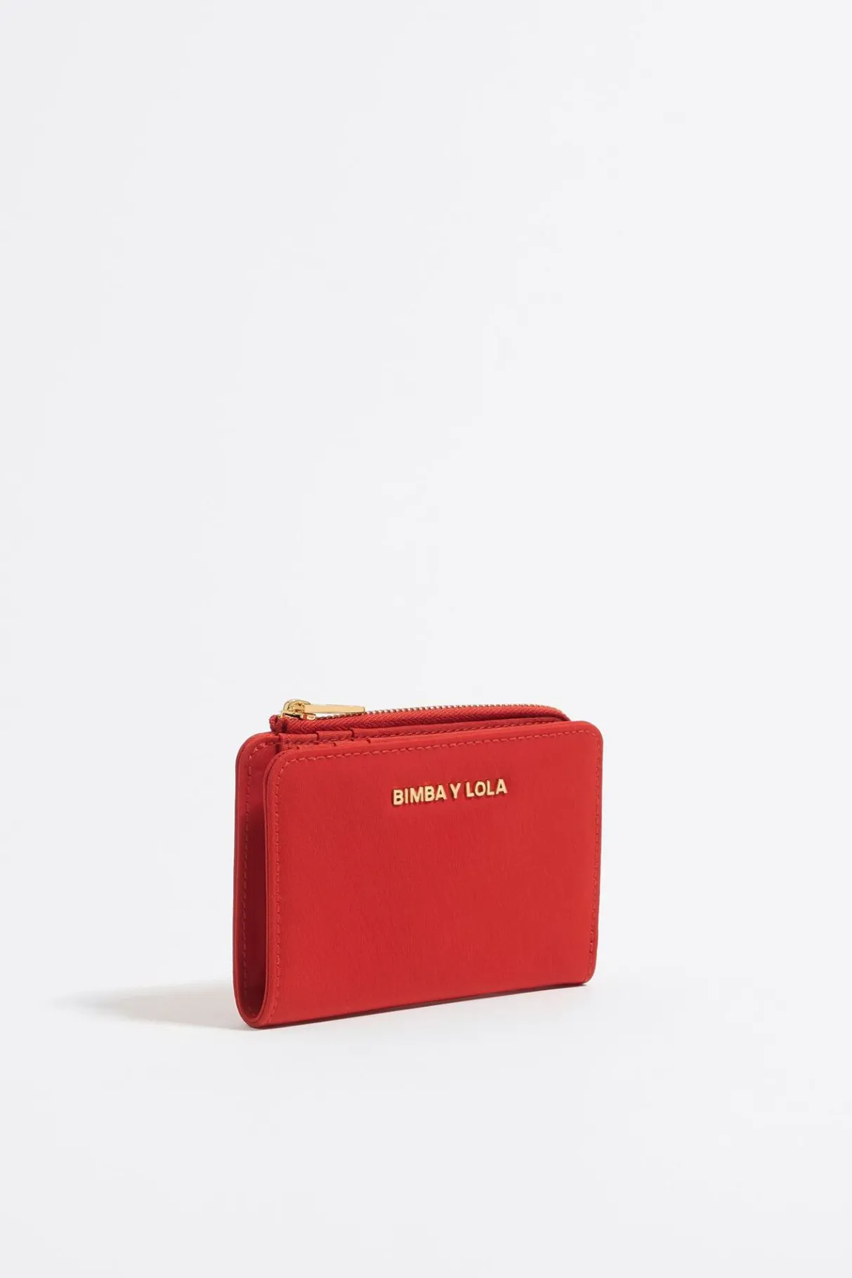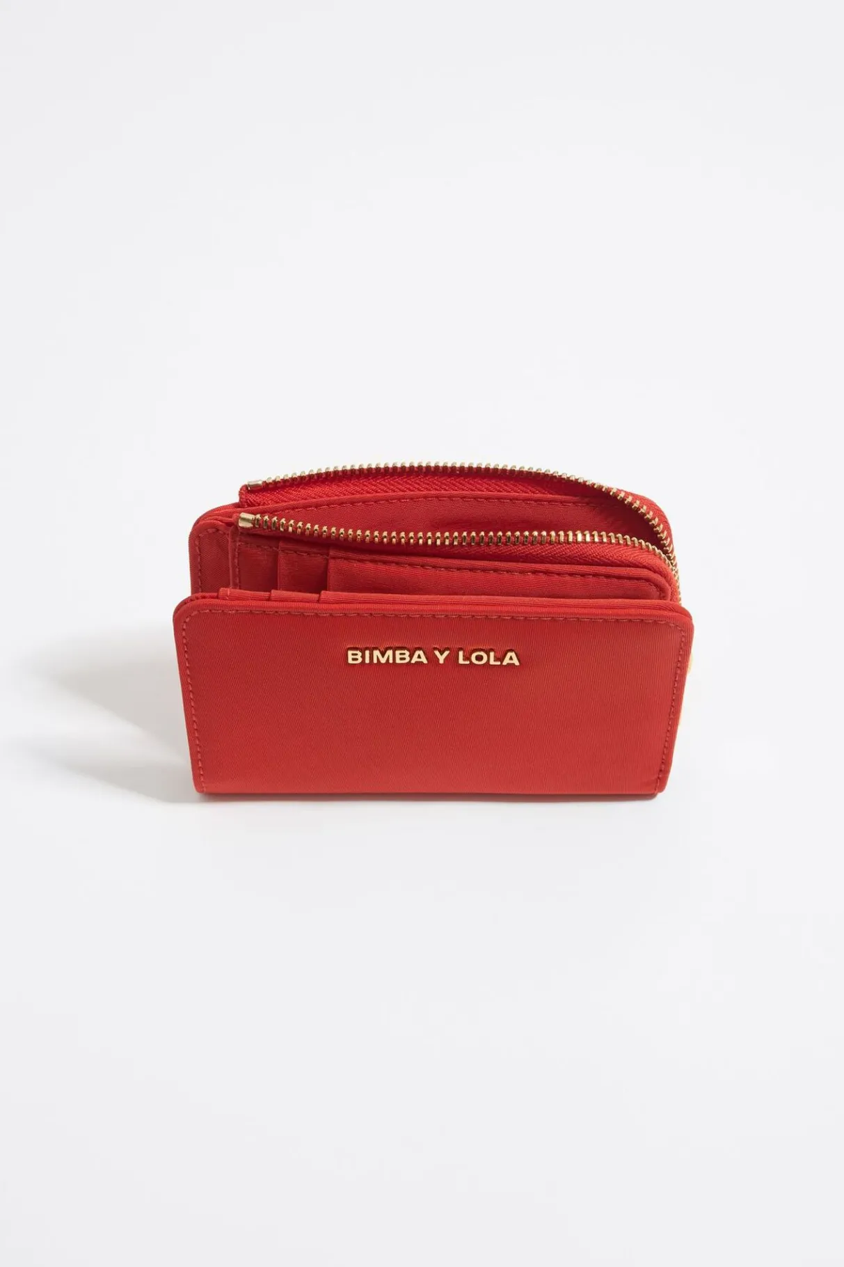 Cartera De Nylon En Color Coral. Modelo Con Cierre De Cremallera Y Snap, Y Tarjetero Interior. Exterior Personalizado Con Logo MetÁLico.