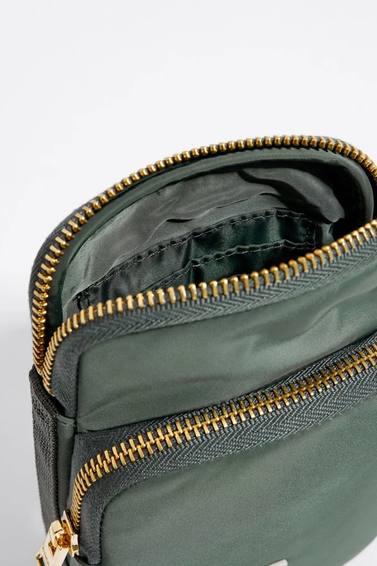 Minibolso Rectangular De Tejido TÉCnico En Color Gris Verdoso. Modelo Con Doble Compartimento E Interior Con Tarjetero MÚLtiple, Cierre De Cremallera Y Asa Bandolera Regulable. Bolsillo Exterior De Rejilla. Exterior Personalizado Con Etiqueta De Piel Logotipada. 100% PoliÉSter Reciclado.