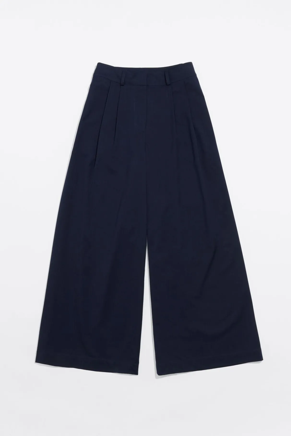 PantalÓN De Lana FrÍA En Color Azul Marino Oscuro. Modelo De Corte Campana, Cierre De Cremallera Frontal, Bolsillos Laterales Y Cintura Con Maxipinzas Delanteras.