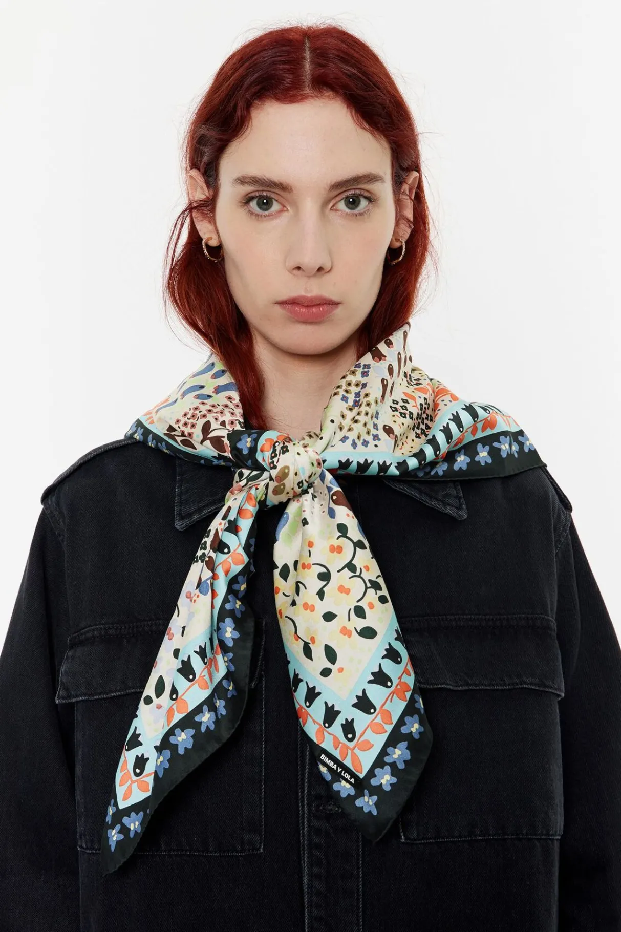 PaÑUelo Con Estampado De Campanillas Sobre Fondo Blanco Roto. Modelo Personalizado Con Etiqueta Logotipada. 100% PoliÉSter Reciclado.