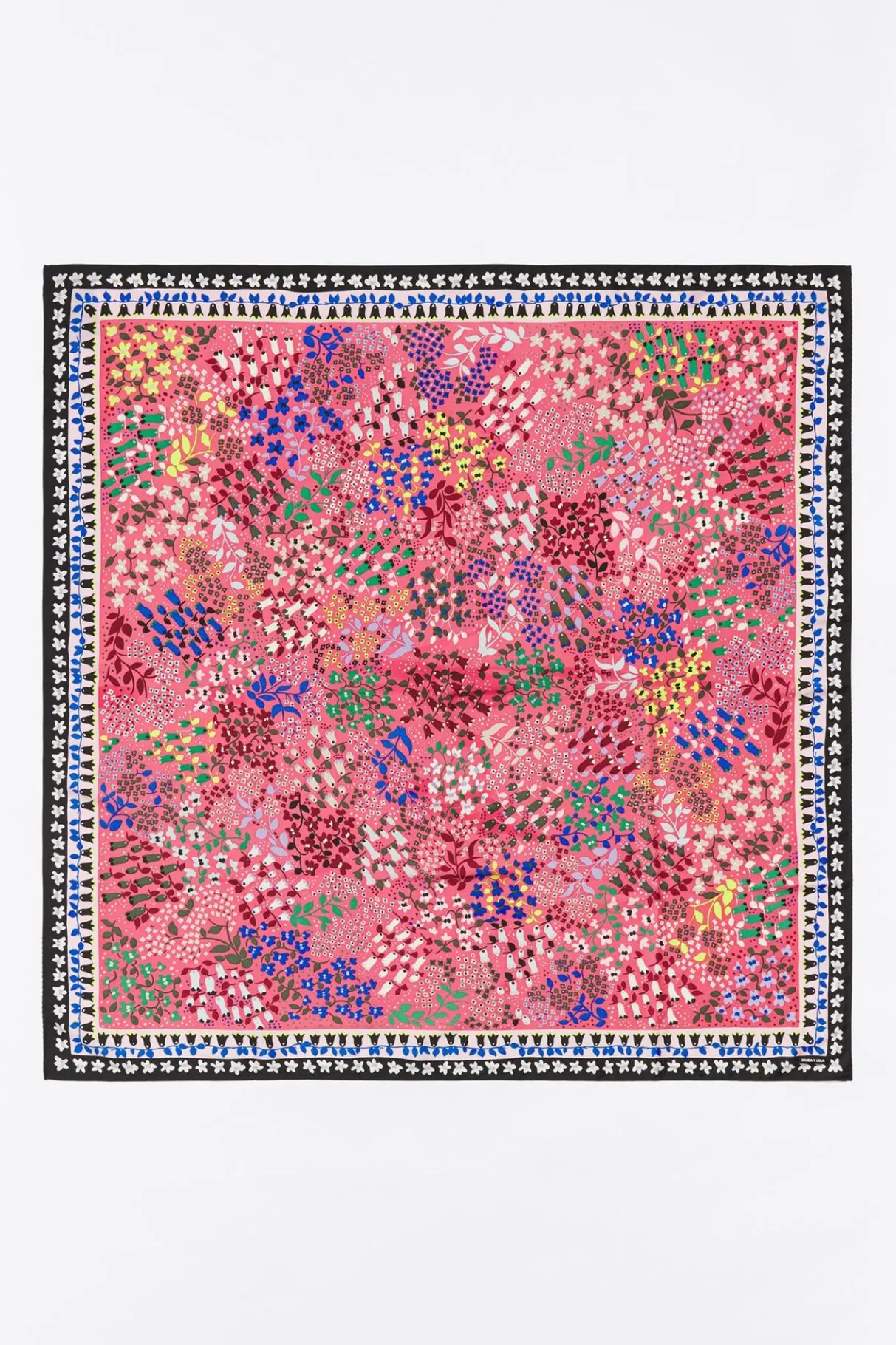 PaÑUelo Con Estampado De Campanillas Sobre Fondo Color Fresa. Modelo Personalizado Con Etiqueta Logotipada. 100% PoliÉSter Reciclado.