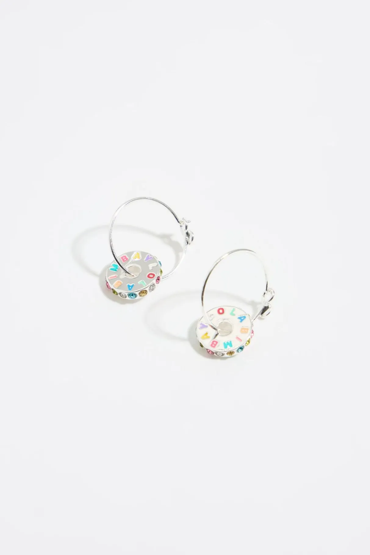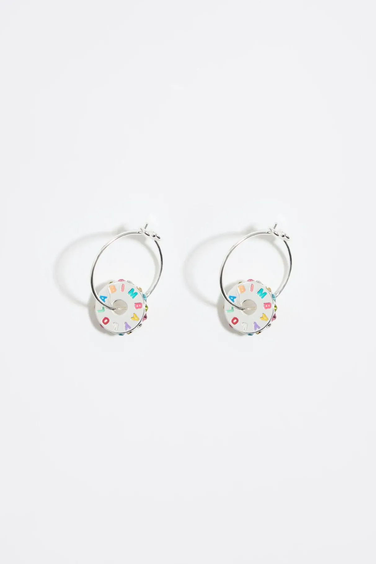 Pendientes De Aro Plateados Y Pieza De Metal Con Logo Grabado Multicolor. Modelo Con Cierre De Gancho.