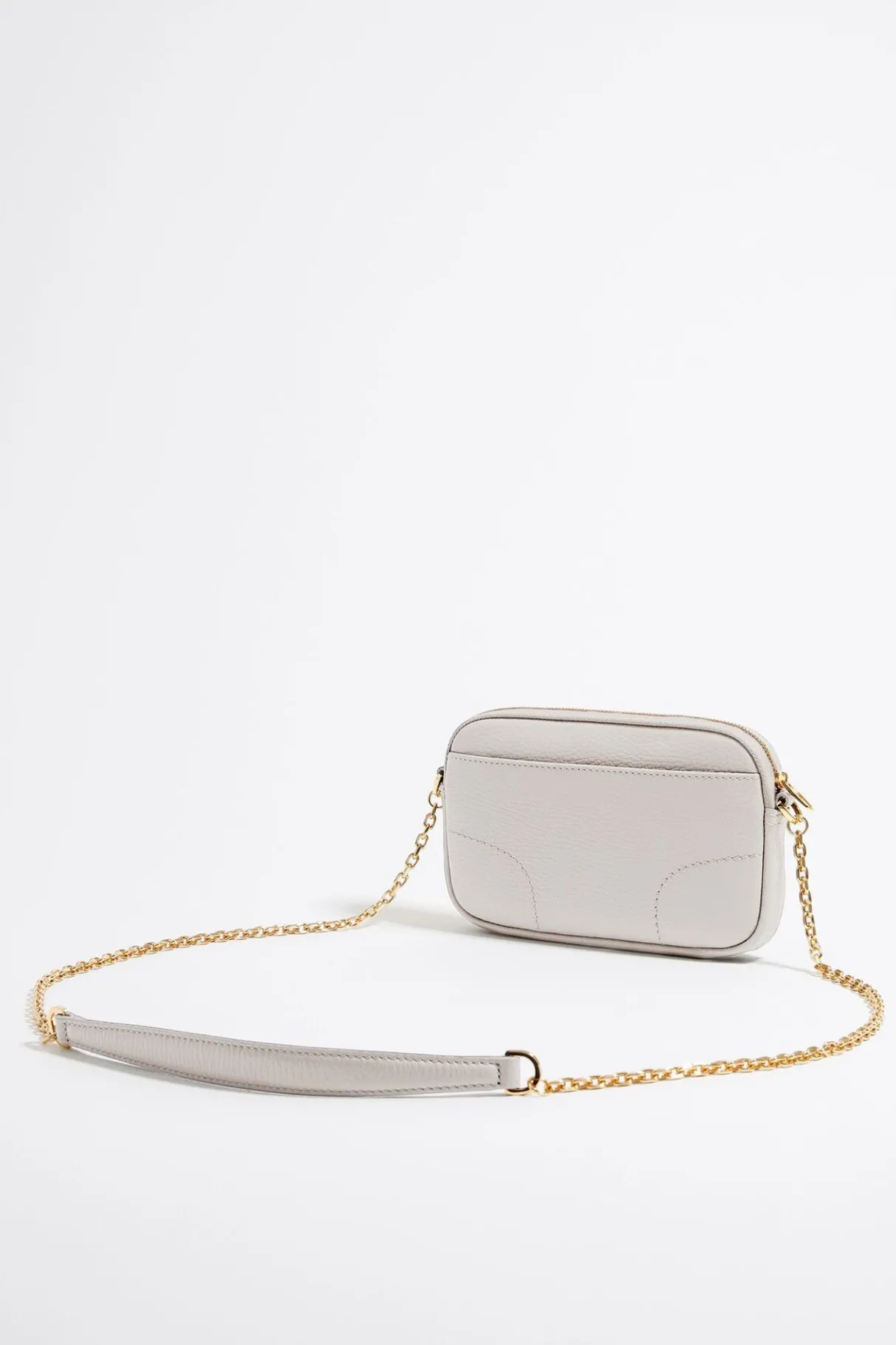 Bolso Bandolera De Piel En Color Blanco Roto. Modelo De TamaÑO Mini Con Cierre De Cremallera, Asa De Piel Y Cadena, Y Bolsillo Interior. Exterior Personalizado Con Logo Lb.