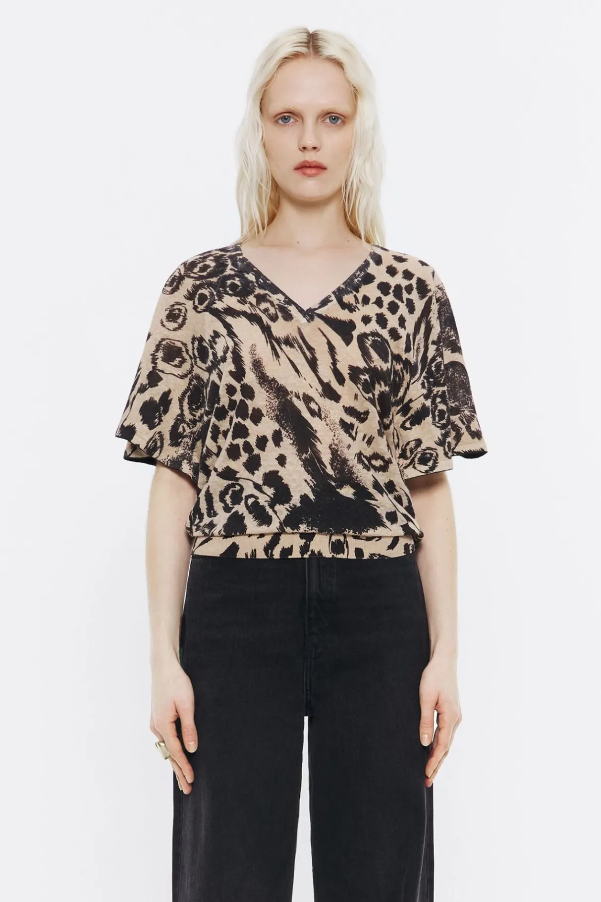 Jersey De Lino Con Print Animal Mix En Color Camel. Modelo De Corte Recto, Escote En V Pronunciado Con Interior Del Cuello A Contraste Y Manga Corta MurciÉLago.