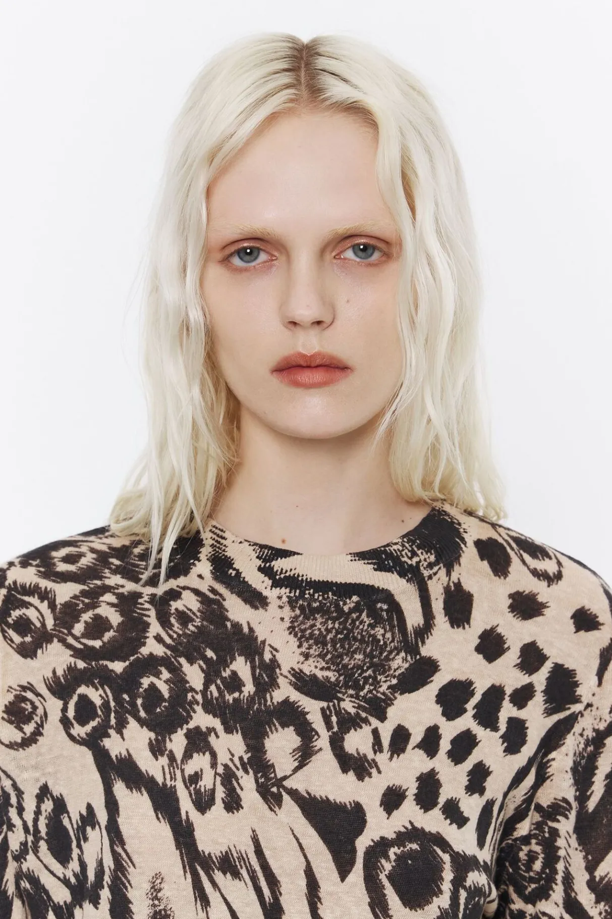 Jersey De Lino Con Print Animal Mix En Color Camel. Modelo De Corte Recto, Escote Caja Y Manga Larga.