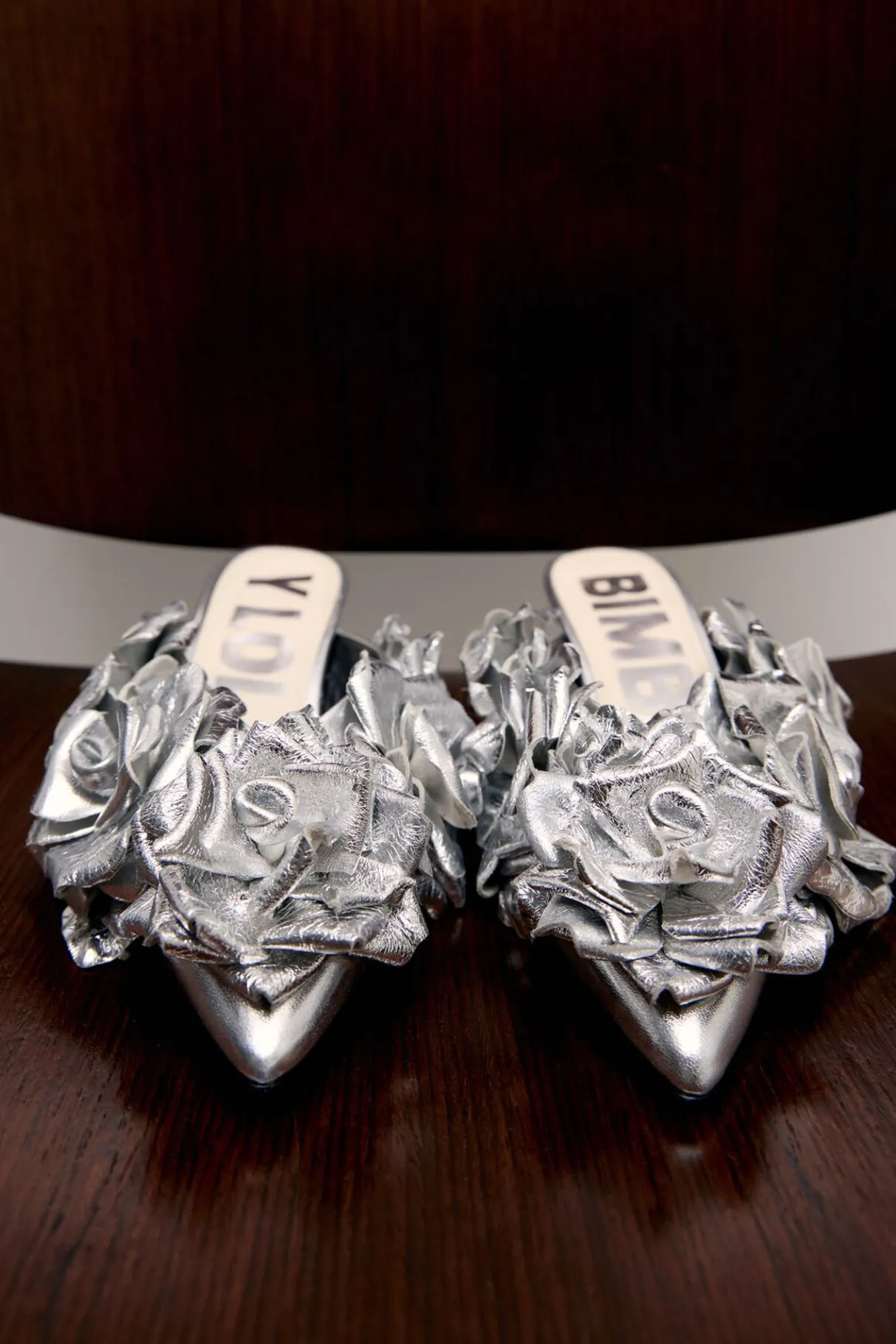 Zapato SalÓN Destalonado De Piel Con Adorno De Flores En Color Plata. Modelo Acabado En Punta Con TacÓN Forrado. Plantilla De Piel Con Logo Grabado Y Suela Personalizada.