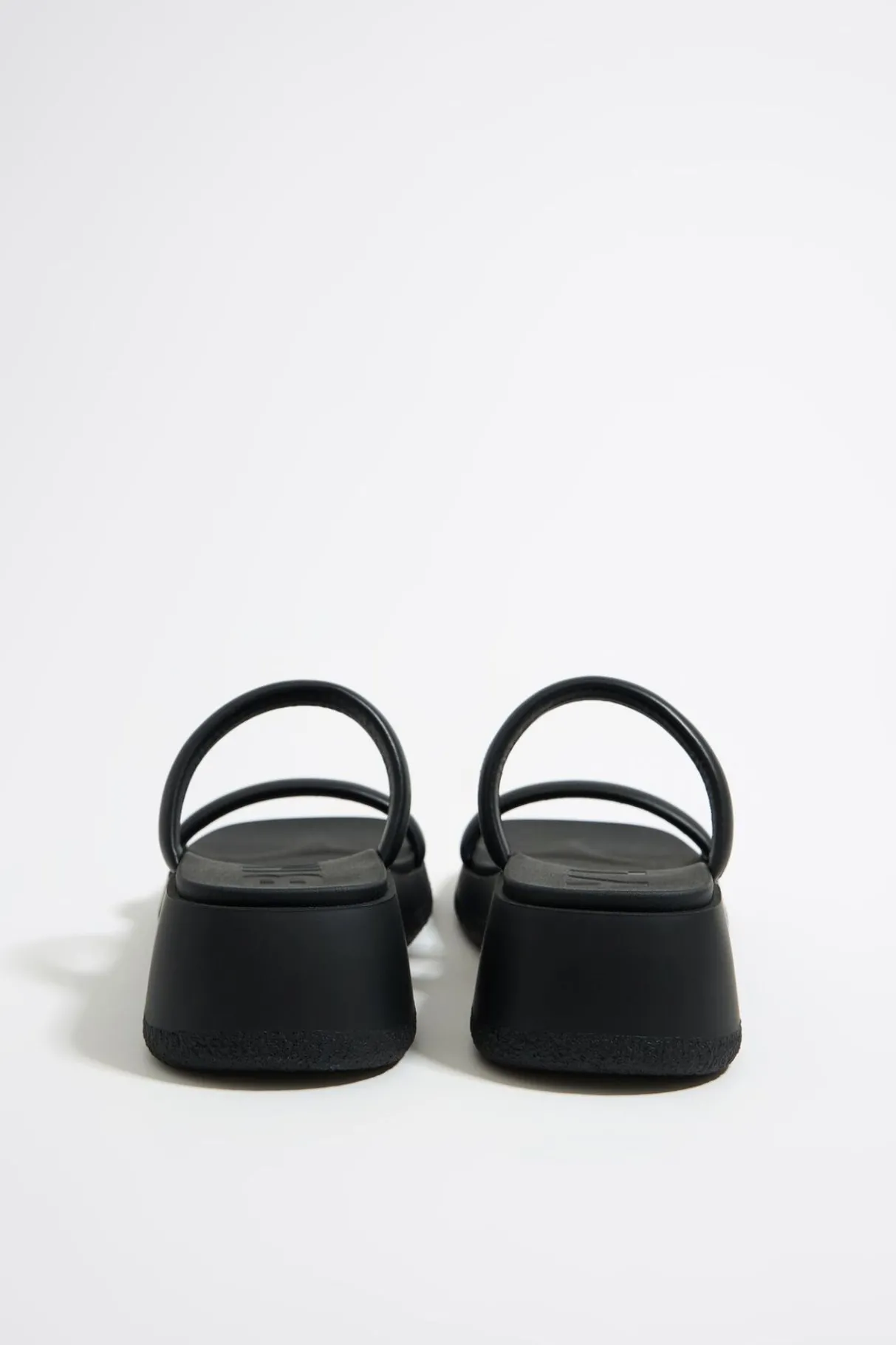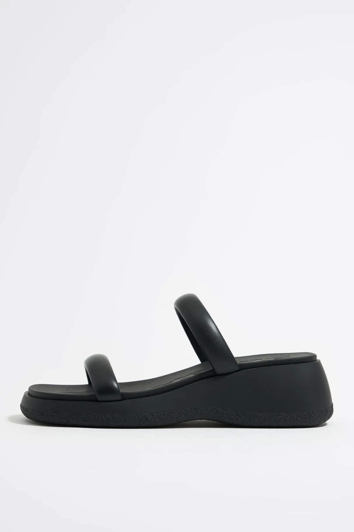 Sandalia De CuÑA De Tiras De Piel En Color Negro. Etiqueta Con Logo En Plantilla Y Piso De Plataforma Con Suela Personalizada.
