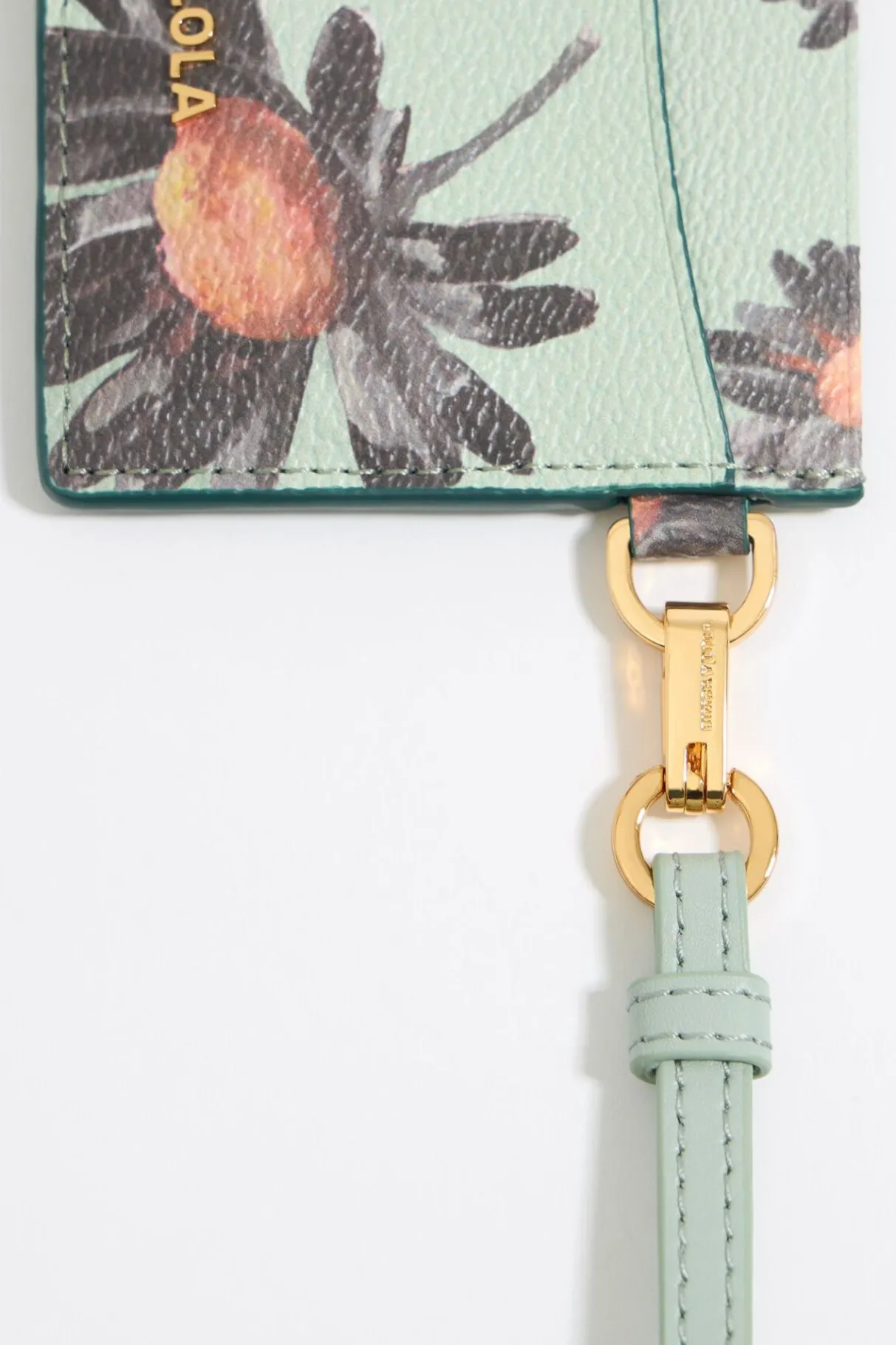 Tarjetero Con Textura Caviar Y Print Daisy En Color Verde. Modelo Con Asa Y Piezas De Piel, Personalizado Con Logo MetÁLico. Este Modelo Contiene 100% Poliuretano De ProducciÓN Responsable + 100% PoliÉSter Reciclado.