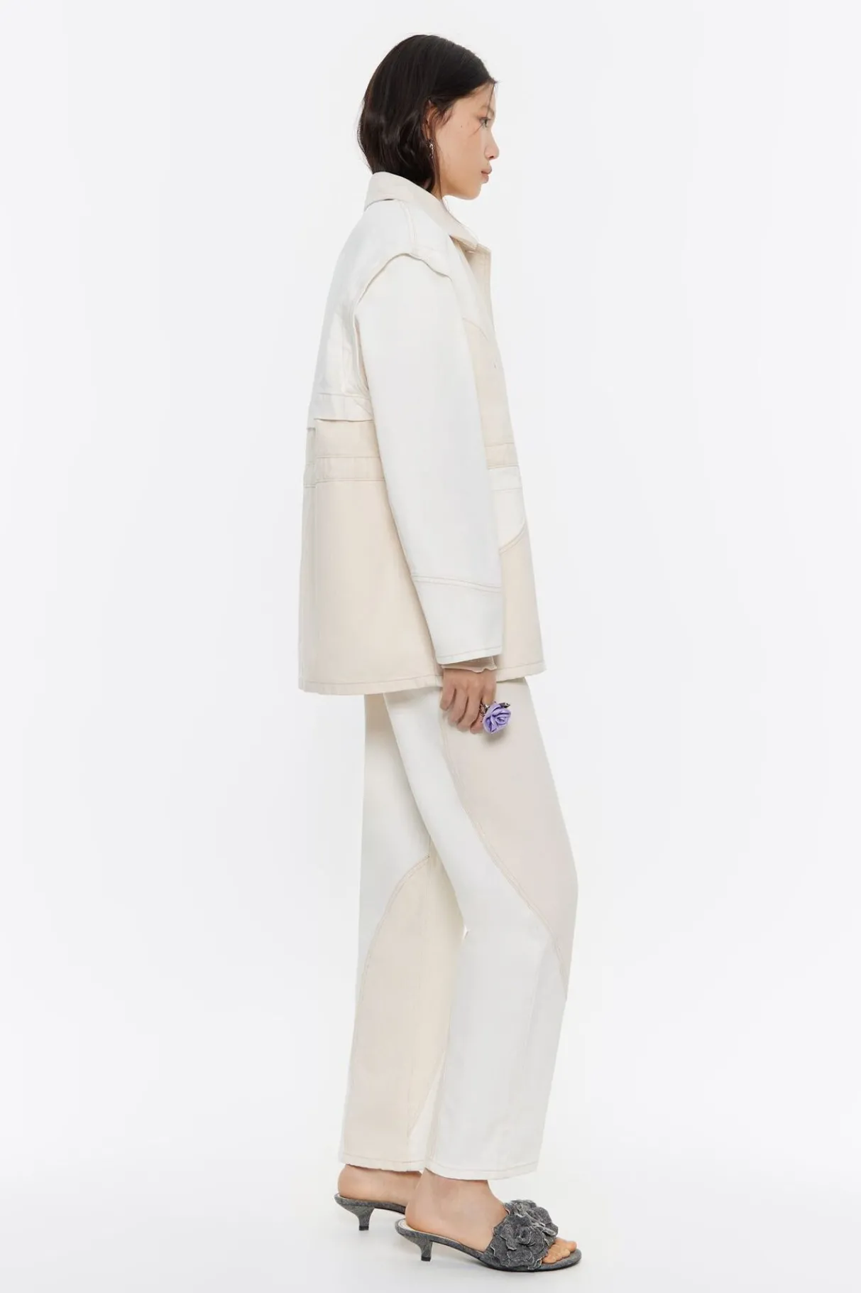Cazadora Corta Denim Bicolor En Color Crudo. Modelo De Corte Recto, Cuello Camisero, Manga 3/4 Con Sisa Superpuesta Y Cierre Frontal De Botonadura Denim. Bolsillos Saco Redondeados En El Delantero Y Costadillos Pespunteados.