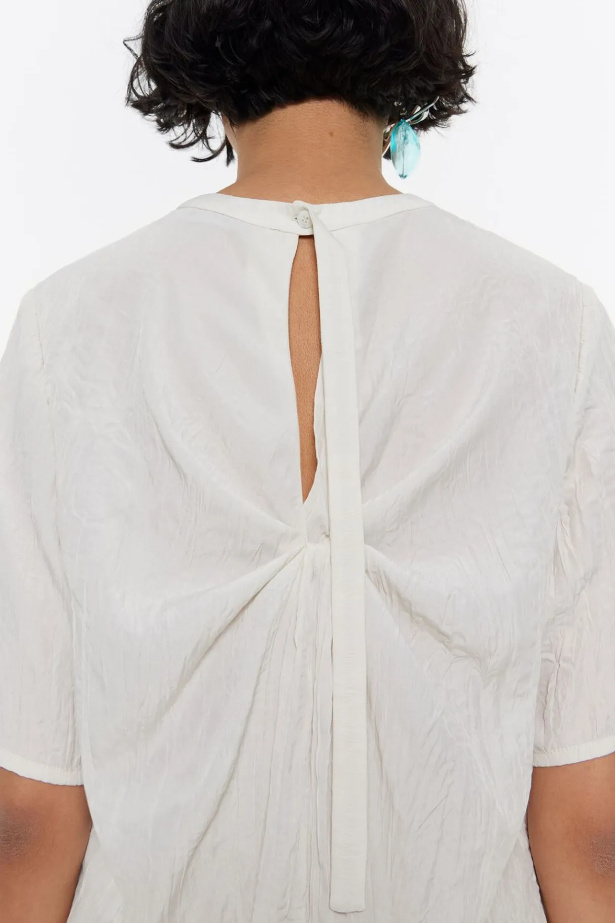 Vestido Midi De Viscosa Con Textura En Color Mantequilla. Modelo De Corte Recto, Con Cuello Caja Con Tira De Punto Larga, Manga Corta Y Cierre Con BotÓN Trasero. Abertura Pronunciada En La Espalda Con Falso Nudo Y Aberturas Laterales.