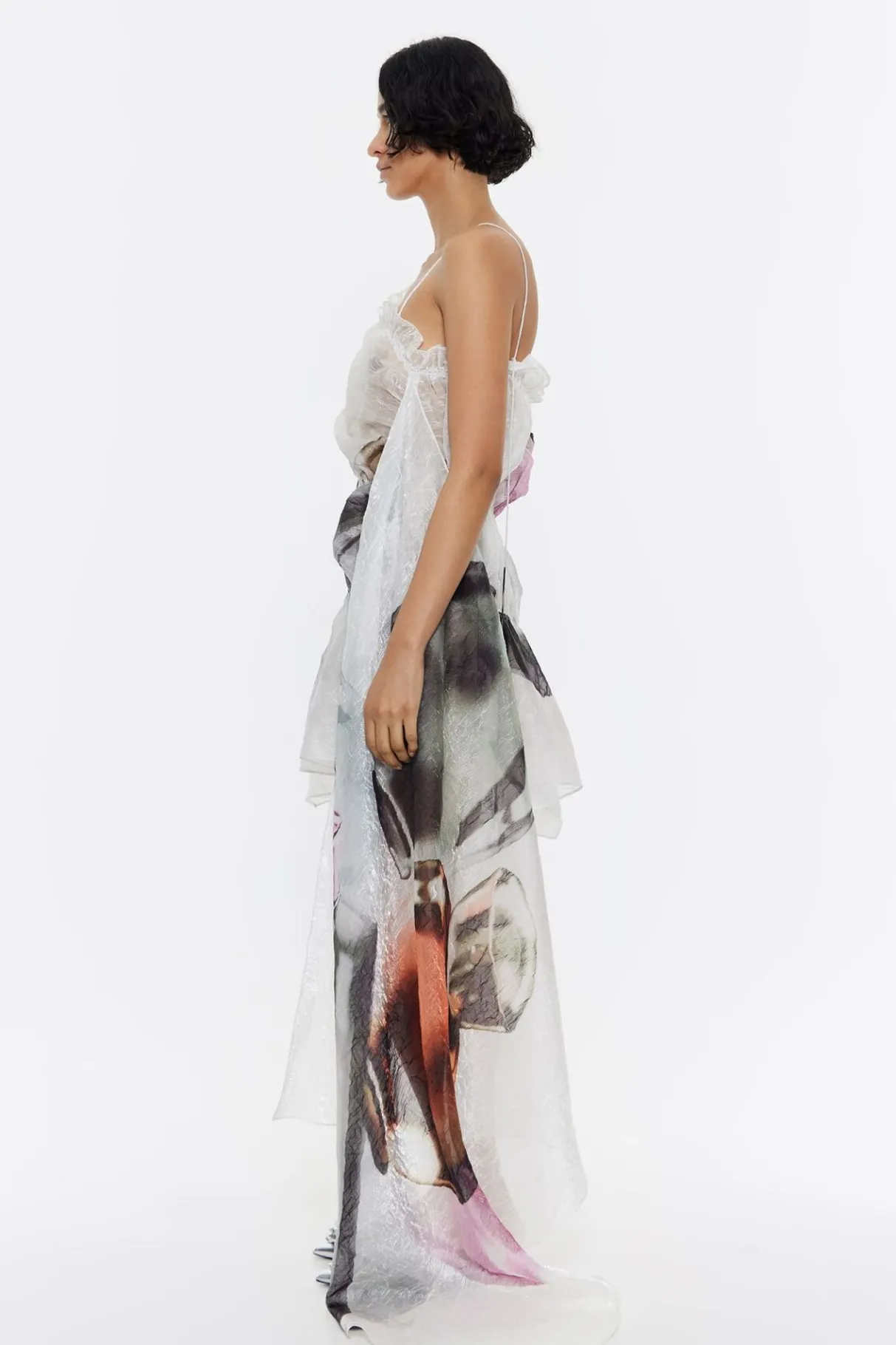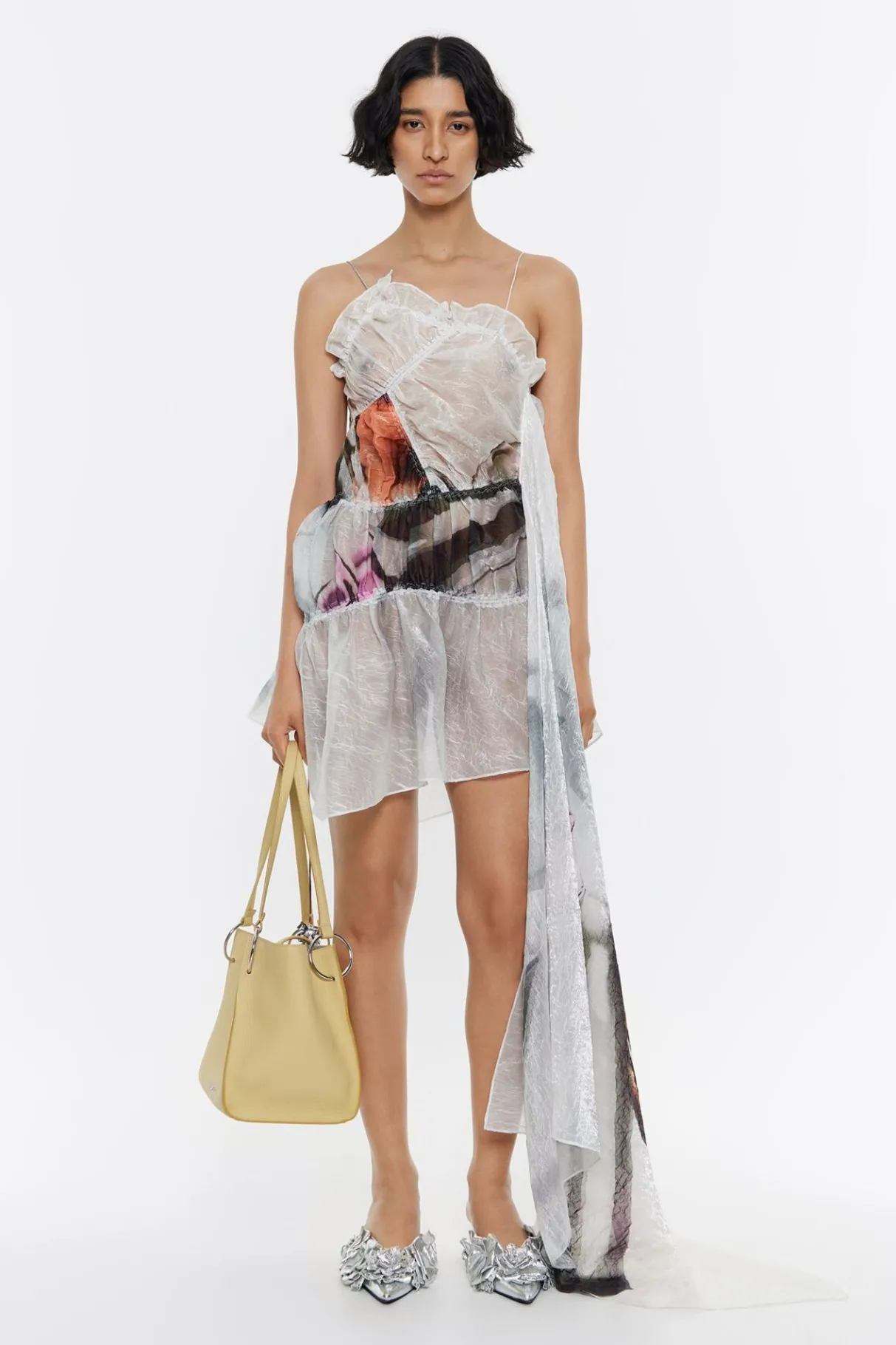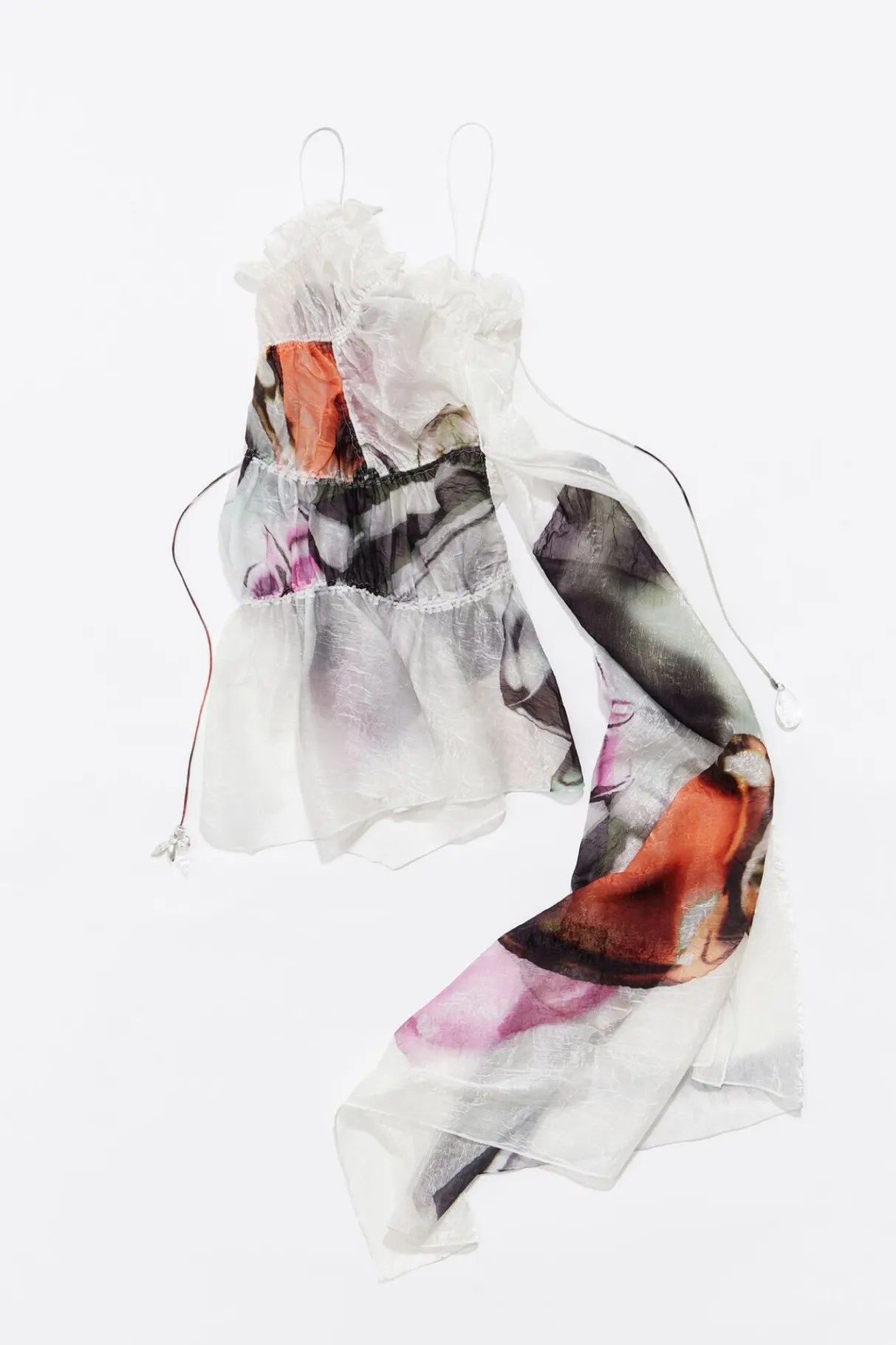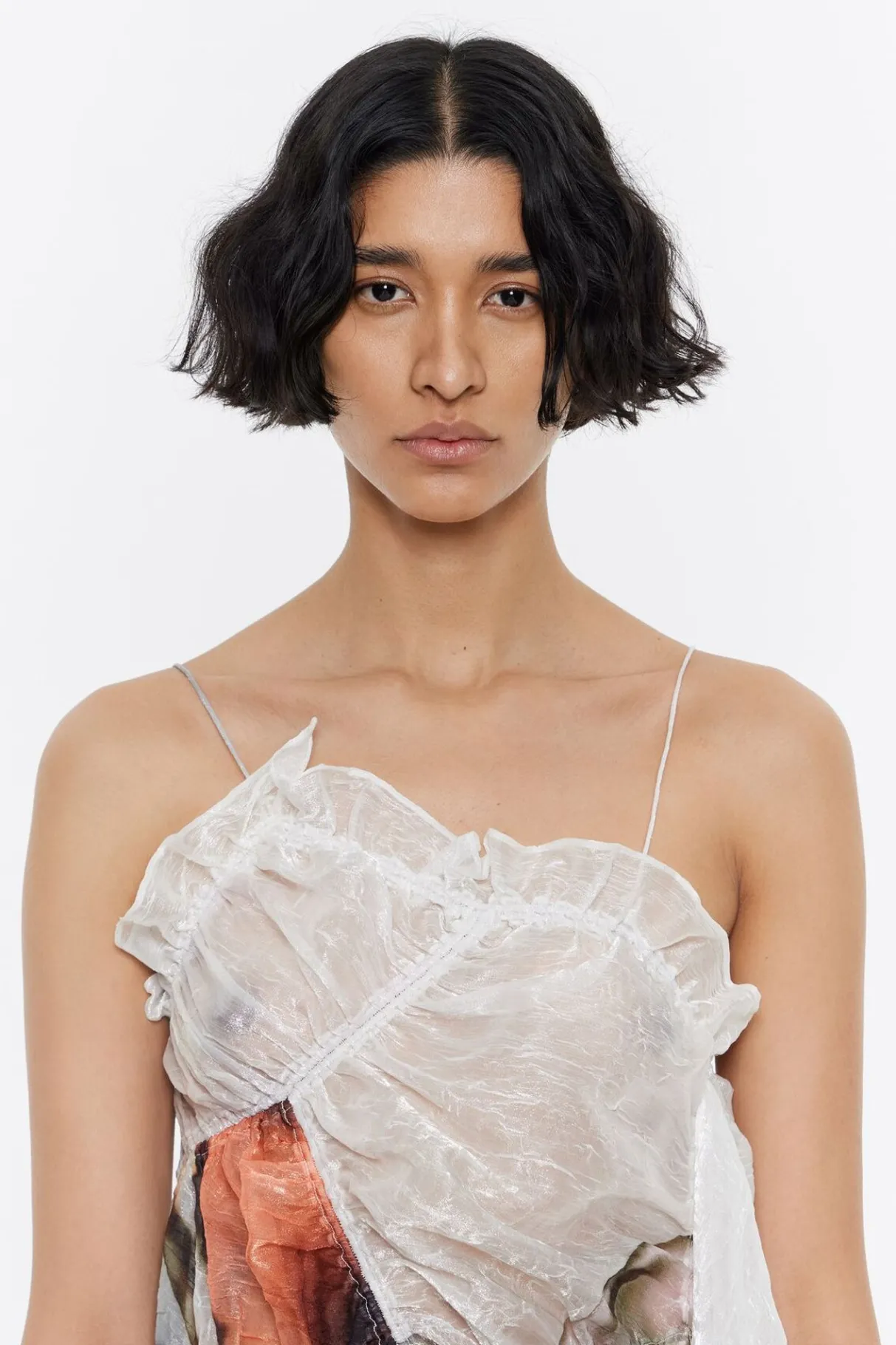 Vestido Fruncido Min De Tejido FantasÍA Con Print Perfume Xl En Color Marfil. Modelo Con Escote Recto, Tirantes De Tejido Y Maxi PaÑUelo En El Lateral.