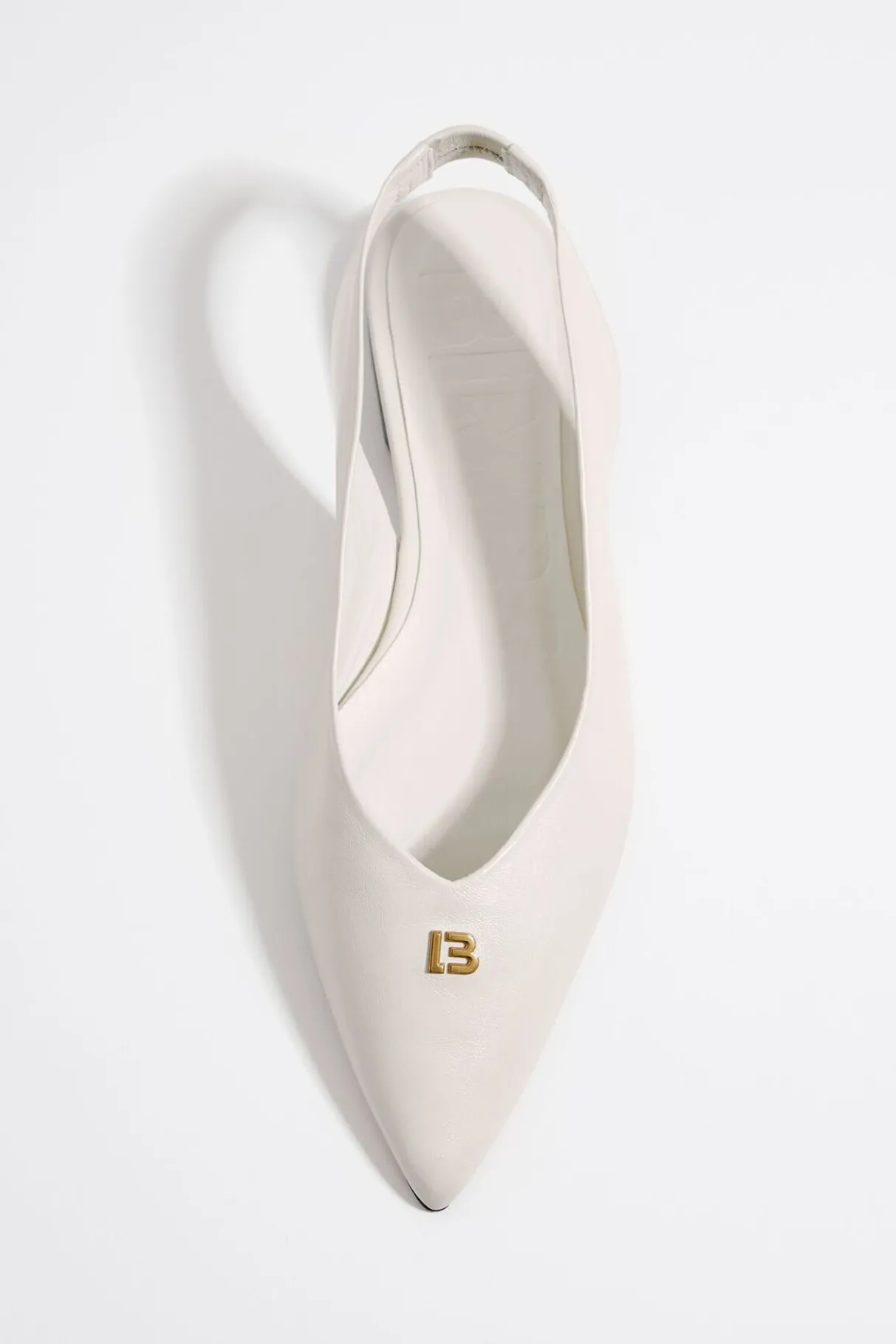 Bailarina De Piel Acabada En Punta Con Logo Lb MetÁLico En La Puntera En Color Marfil. Modelo Destalonado Con ElÁStico Trasero. Plantilla De Piel Con Logo Grabado Y Suela Personalizada.
