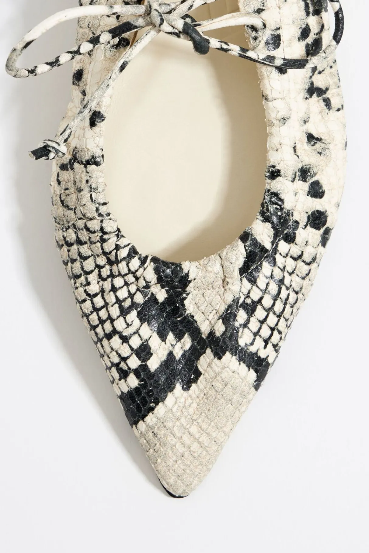 Bailarina De Piel Con Print De Serpiente En Color Beige. Modelo Acabado En Punta, Sin Forro Con Escote Fruncido Ajustable Con CordÓN De Piel. Plantilla Con Logo Grabado Y Suela De Cuerolite Moldeado Logotipada.