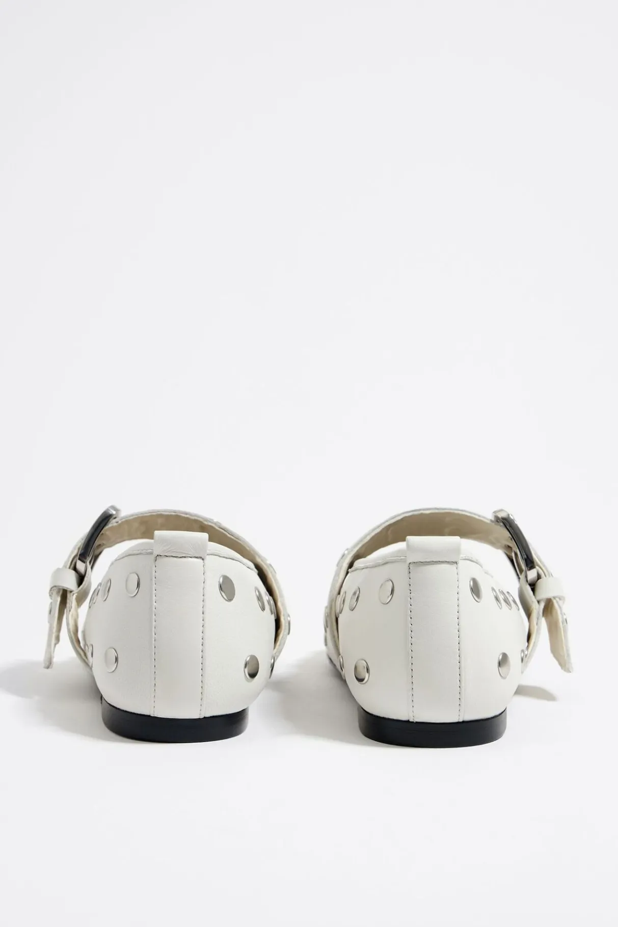 Bailarina Con Tachas De Piel En Color Blanco. Modelo Acabado En Punta Con Tira Ajustable En El Empeine Y Hebilla De Doble Pincho. Plantilla De Piel Con Logo Grabado Y Suela Personalizada.