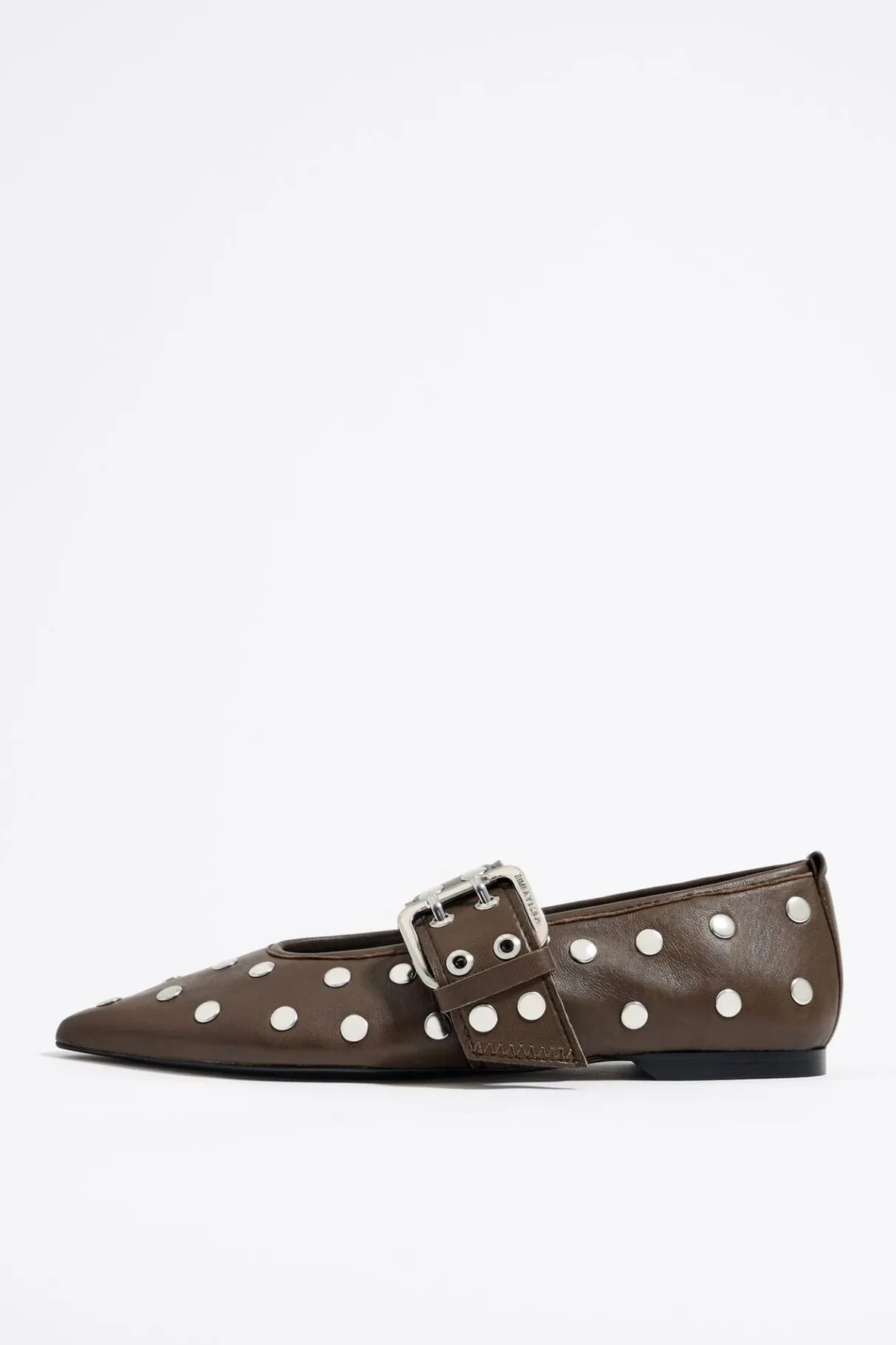 Bailarina Con Tachas De Piel En Color MarrÓN. Modelo Acabado En Punta Con Tira Ajustable En El Empeine Y Hebilla De Doble Pincho. Plantilla De Piel Con Logo Grabado Y Suela Personalizada.